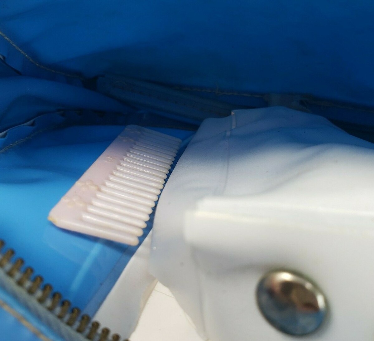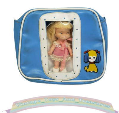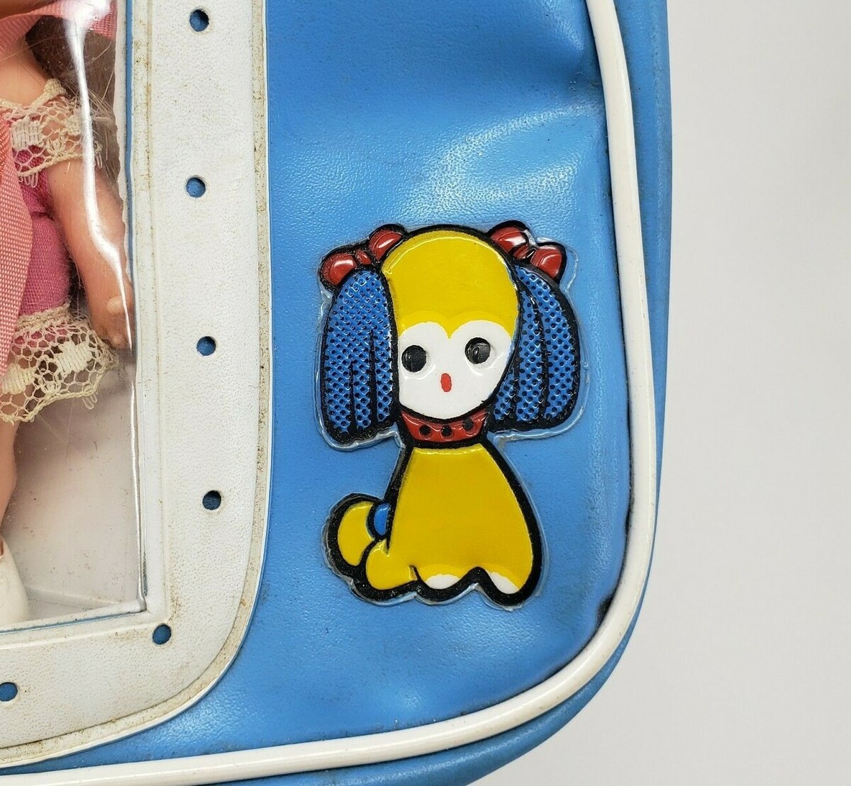VINTAGE MINI BLONDE DOLL IN BLUE PUPPY DOG VINYL CARRYING CASE HONG KONG ANTIQUE