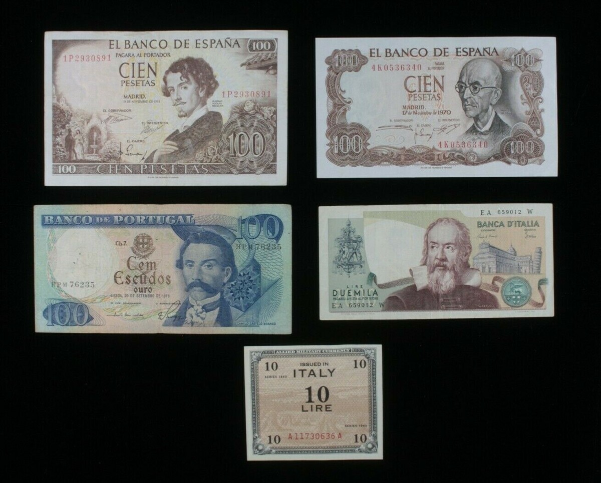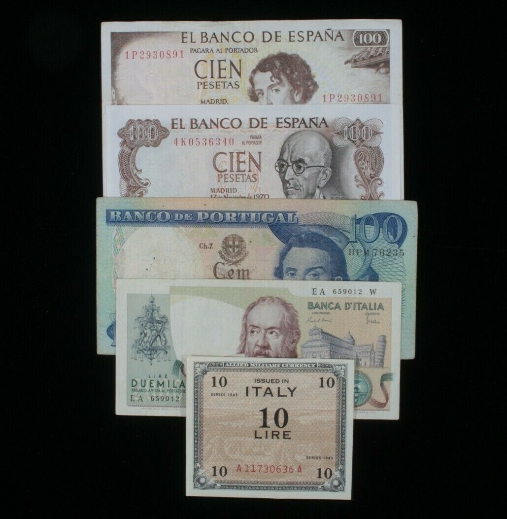 Southern Europe 5-Notes Lot // Spain Peseta, Portugal Escudo Italy Lira