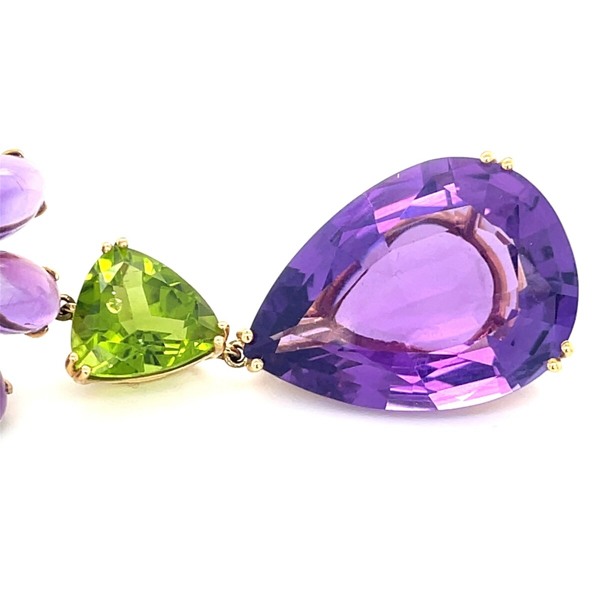 Centering an oval peridot suspending a triangular-cut peridot and a large pear-shaped amethyst