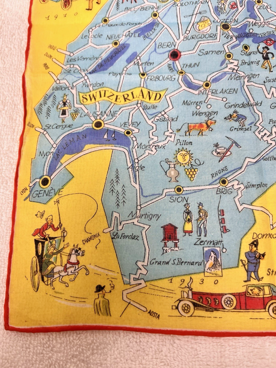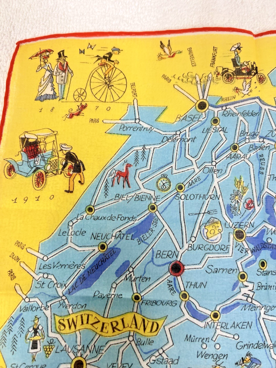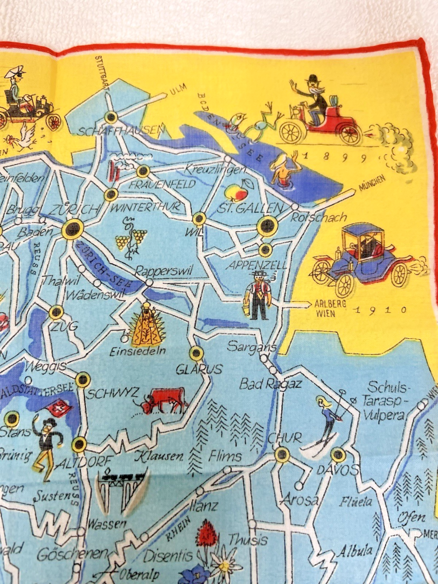 Vintage Handkerchief Hankie Map of Switzerland Cities Cars Animals Unused 11".