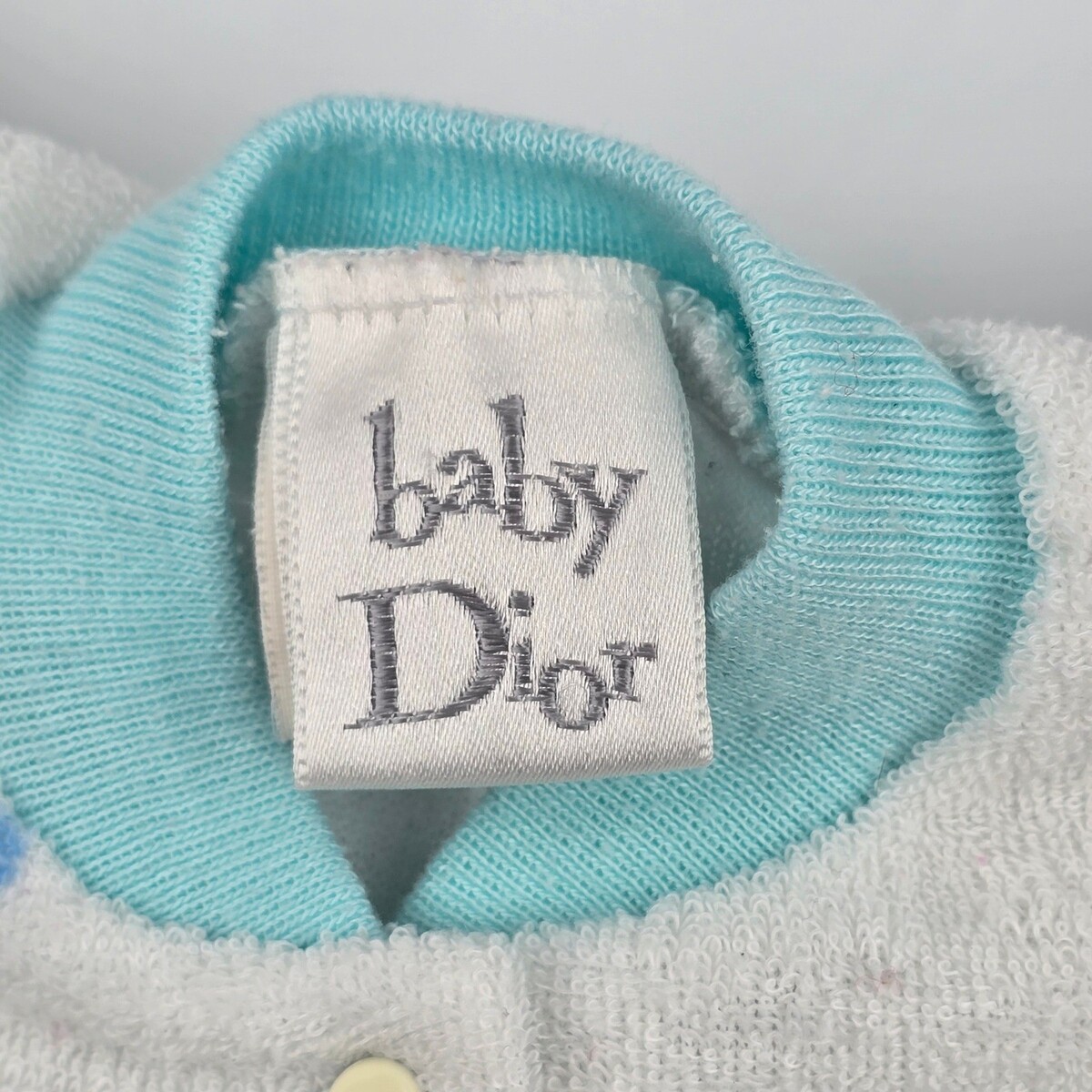 Keywords: Vintage Baby Dior, Designer Baby Clothes, 80s Baby, 90s Baby, Luxury Sleepwear, Alphabet Print, Gender Neutral, Retro Baby, Made in USA, Soft Terry, Newborn Essentials, Designer Layette, Dior Kidswear