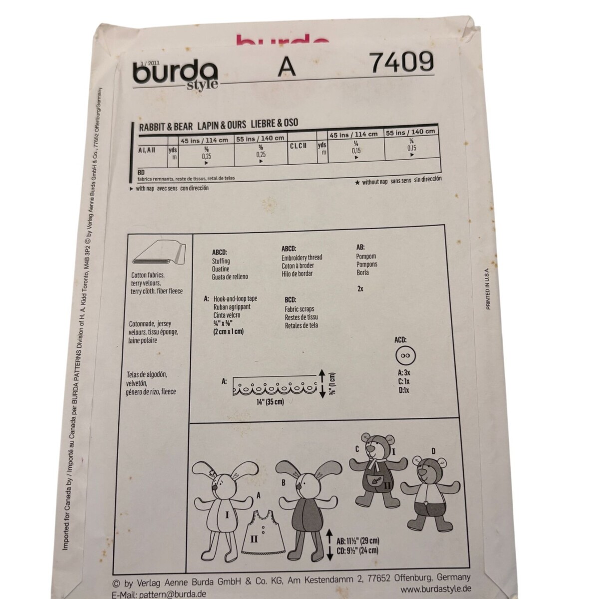 Burda Style 7409 Sewing Pattern For Rabbit & Bear Plush Toys Includes Outfits