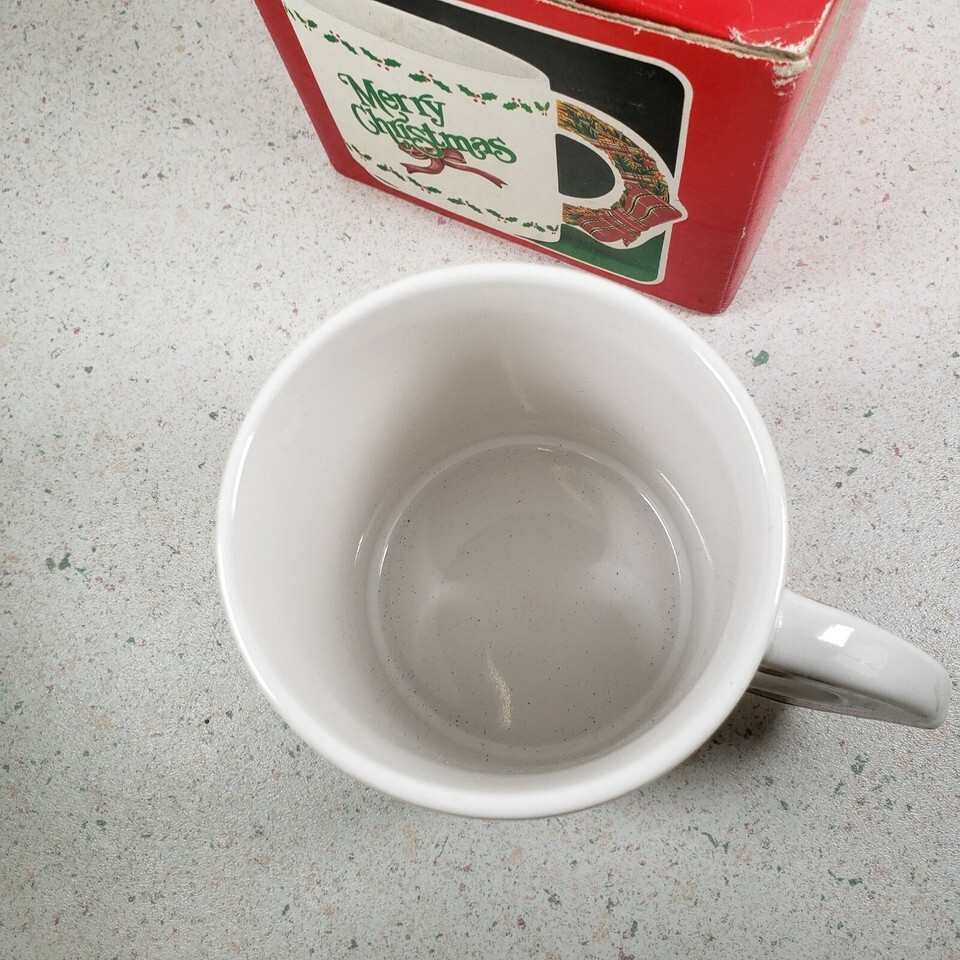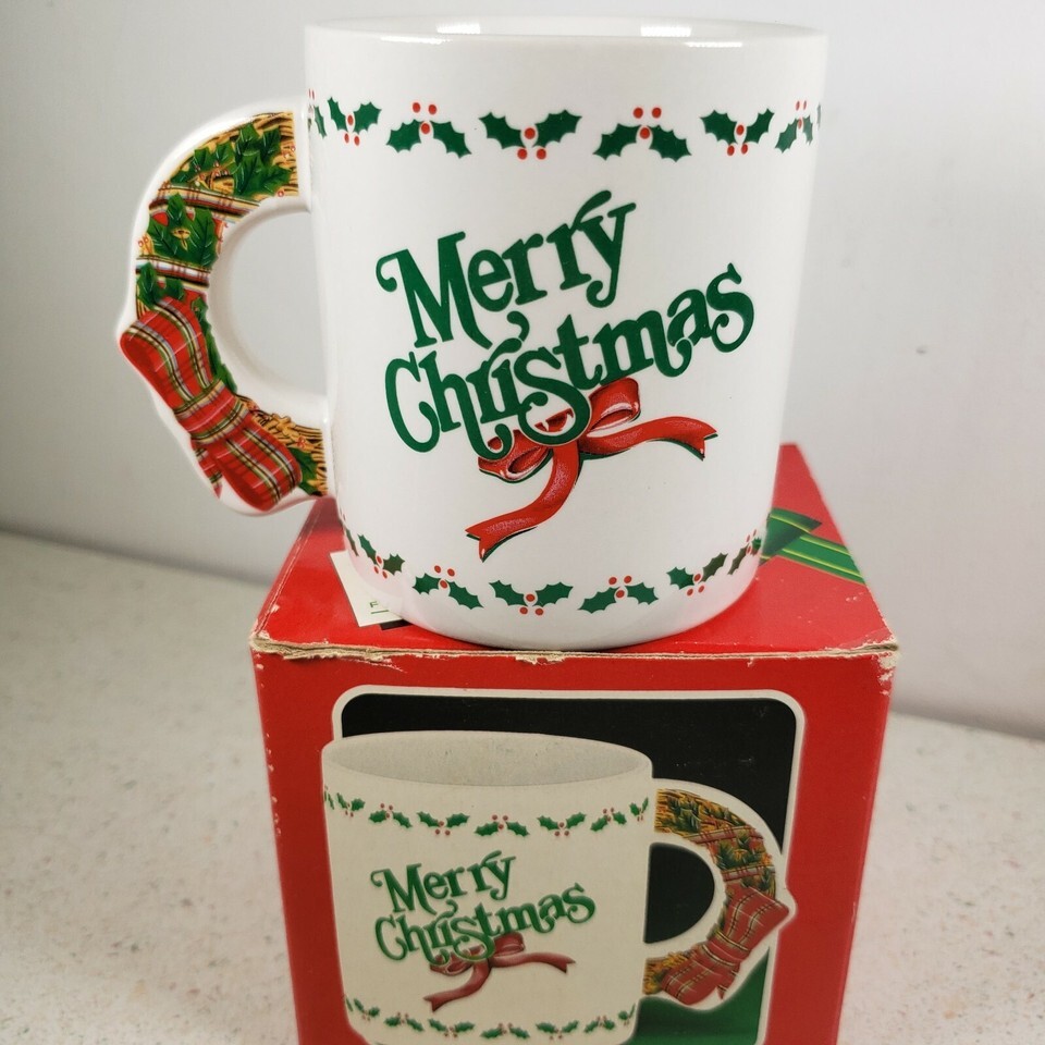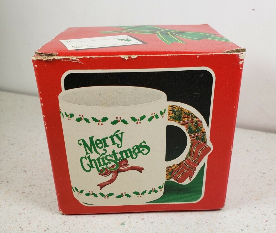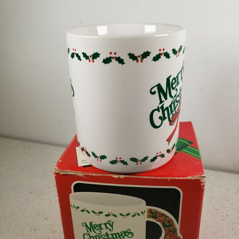 The Love Mug Holly Wreath Bow 1986 Vintage Merry Christmas Coffee Tea Cup NIB
