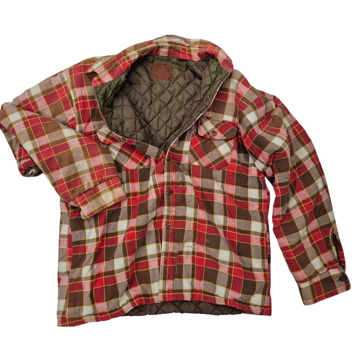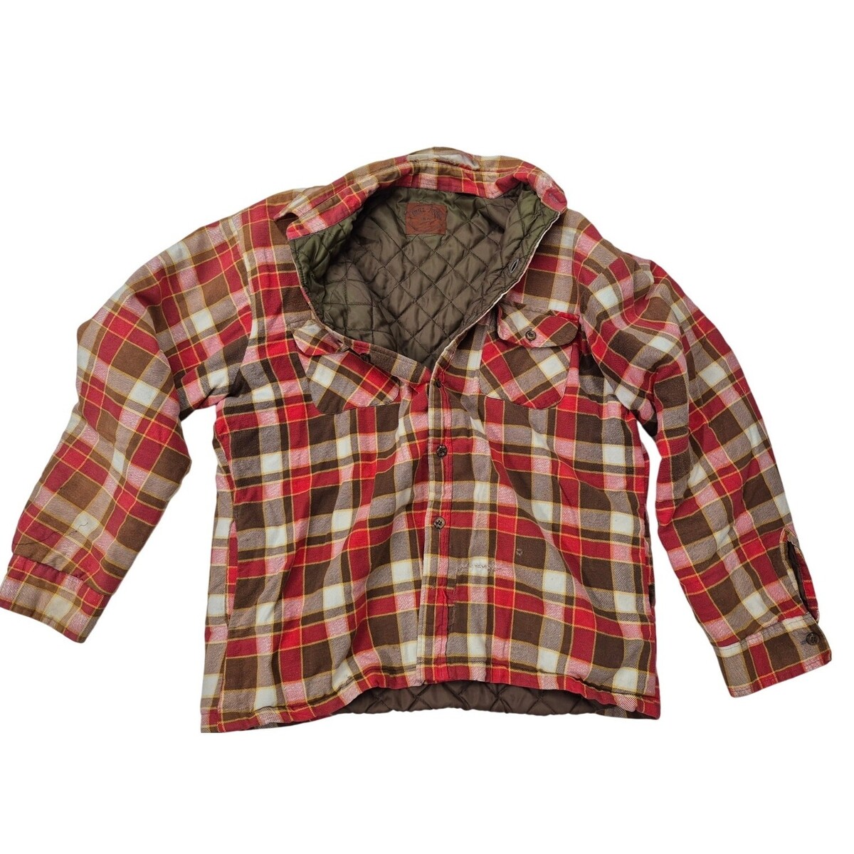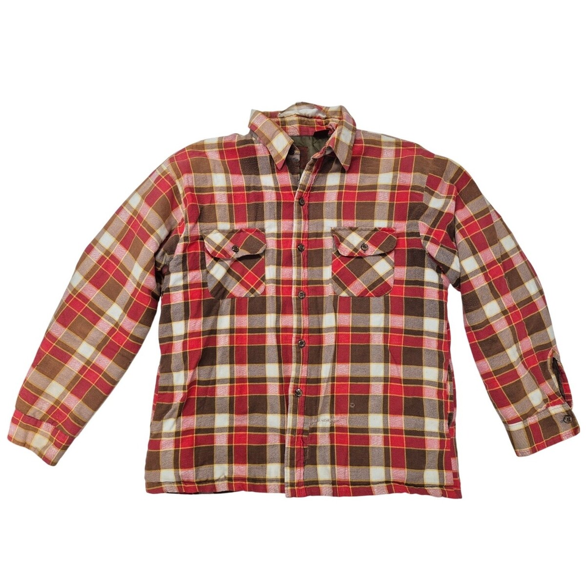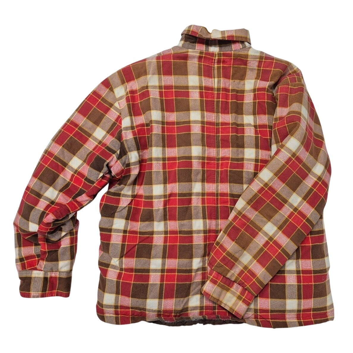 90s vtg Bull Run Cotton Plaid Shirt-Jac Red/Brown Quilted Lining Sz L