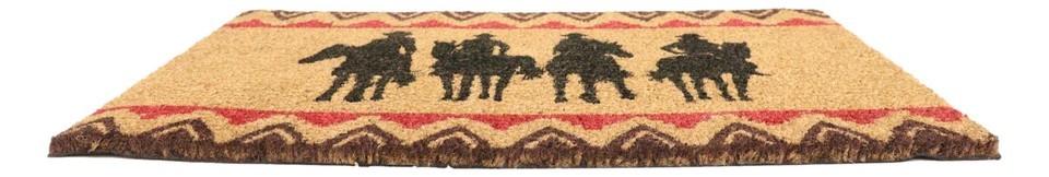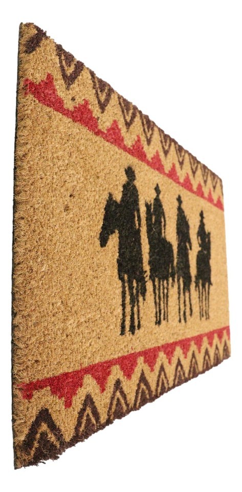 ? With earth tone colors, we feature the spirit of the Wild Wild West with this coir floor mat. 4 cowboys horse riders stand side by side in silhouettes with their signature hats. The mat is bordered by Navajo Southwestern vectors patterns.