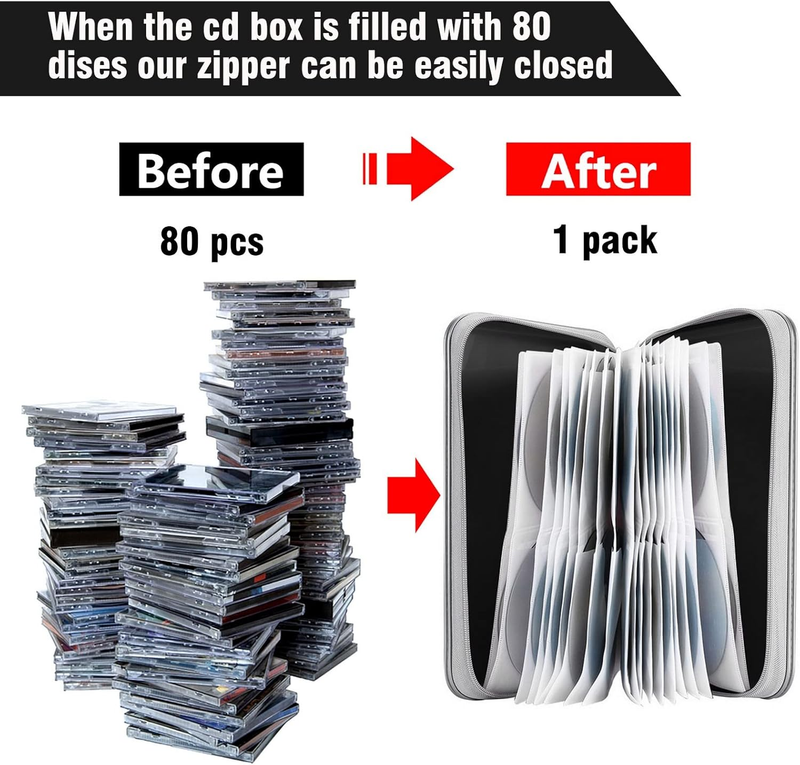 High Quality: To effectively protect CD and DVD discs, we tested PP films and non-woven fabrics of different thicknesses and chose the most suitable thickness to ensure long-term use without scratching the disc. The zipper is smooth and easy to use, it can be easily closed after 80 CDs are filled.