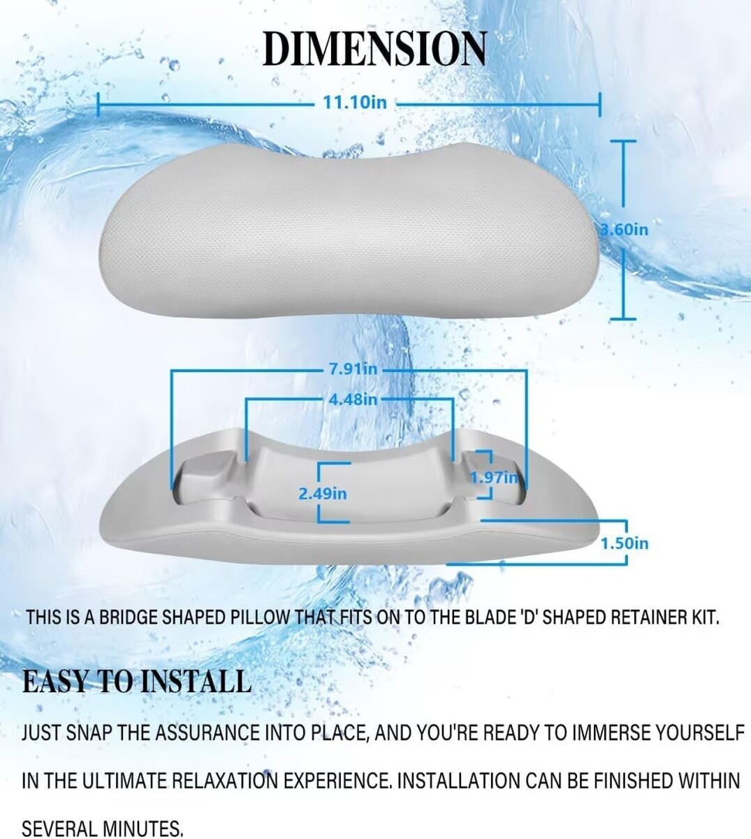Easy to Install ? This is a bridge shaped pillow that fits on to the blade 'D' shaped retainer kit. Just snap the assurance into place, and you're ready to immerse yourself in the ultimate relaxation experience. Installation can be finished within several minutes.