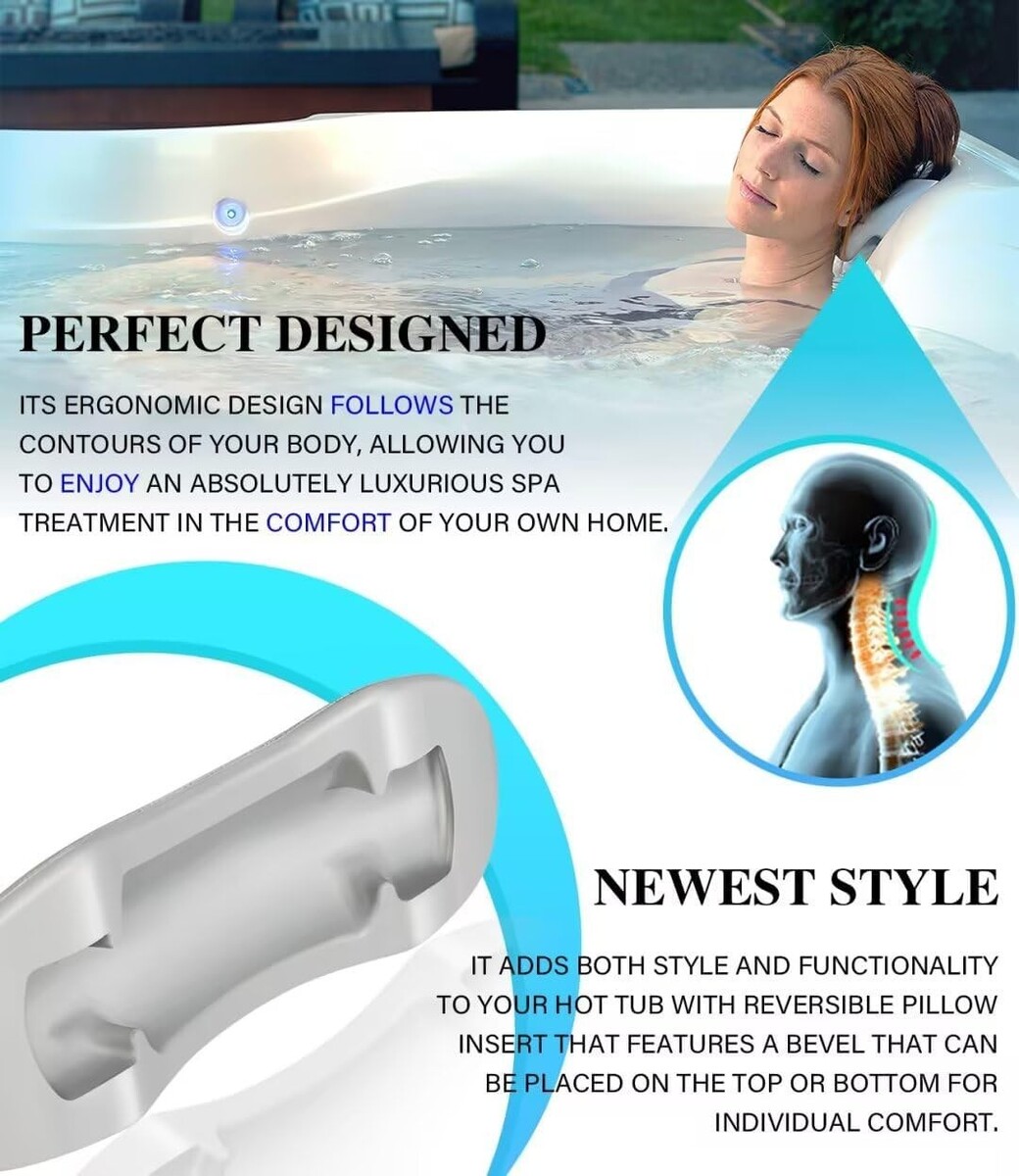 Perfect Designed ? Newest style with reversible pillow insert that features a bevel that can be placed on the top or bottom for individual comfort. It adds both style and functionality to your Hot tub, and its ergonomic design follows the contours of your body, allowing you to enjoy an absolutely luxurious spa treatment in the comfort of your own home.