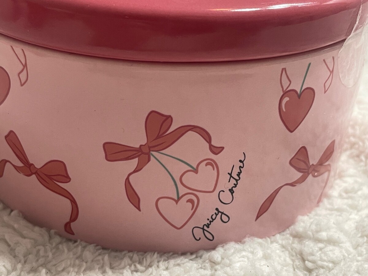Juicy Couture Pink Ceramic Trinket Jar w/ Lid Heart Bow Vanity Jewelry Box