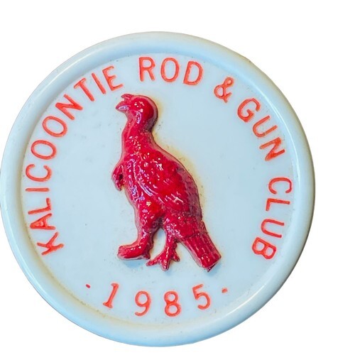 This vintage pinback button is a must-have for collectors of memorabilia related to hunting and fishing. The KALICOONTIE Rod Gun Club c 1985 . White plastic Pinback Button features the name of the club along with an applied plastic pheasant and the dates of 1985. The original location of the club was in Glenco Mills, NY in Columbia County. It later relocated to Livingston NY. It is a rare find that is sure to be a valuable addition to any collection of pinbacks.