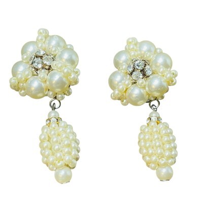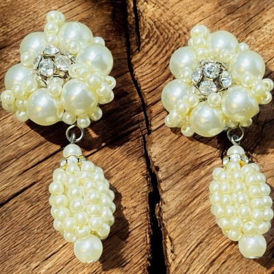 Enhance your vintage jewelry collection with these stunning pearl beaded clip-on earrings. Featuring a classic floral cluster design with faux pearls and rhinestone accents, these earrings exude timeless elegance. The dangling beaded drop adds a touch of sophistication, making them perfect for weddings, formal events, or vintage-inspired outfits.