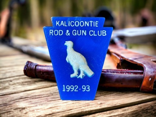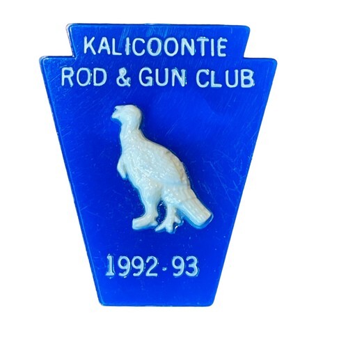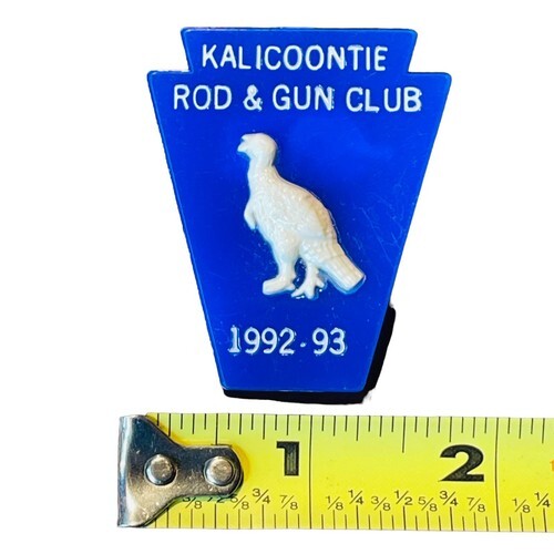 This vintage pinback button is a must-have for collectors of memorabilia related to hunting and fishing. The KALICOONTIE Rod Gun Club c 1993 . Bright blue plastic Pinback Button features the name of the club along with an applied plastic pheasant and the dates of 1992-93. The original location of the club was in Glenco Mills, NY in Columbia County. It later relocated to Livingston NY. It is a rare find that is sure to be a valuable addition to any collection of pinbacks.