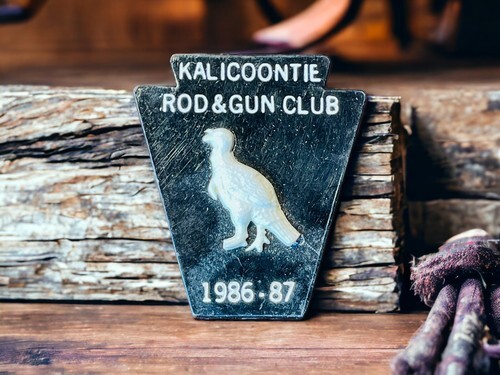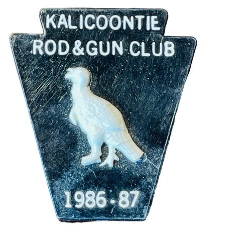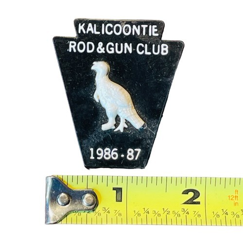 This vintage pinback button is a must-have for collectors of memorabilia related to hunting and fishing. The KALICOONTIE Rod Gun Club c 1986-87. Black plastic Pinback Button features the name of the club along with an applied plastic pheasant and the dates of 86-87. The original location of the club was in Glenco Mills, NY in Columbia County. It later relocated to Livingston NY. It is a rare find that is sure to be a valuable addition to any collection of pinbacks.