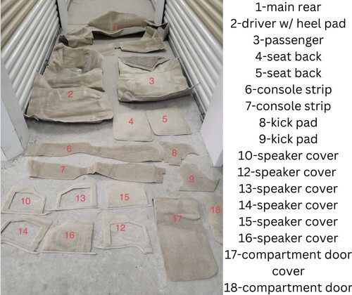 C3 Corvette Complete 17pc Molded Cutpile Carpet Set -Doeskin Camel. Originally purchased for my ?81, but later decided to go with another color scheme. Has been kept in a storage tote in air conditioned storage. Brand new, never used.