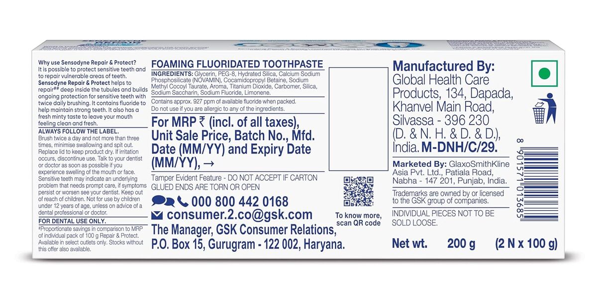 Sensodyne Toothpaste Repair and Protect | Tooth Paste for Daily Sensitivity Protection, Long-lasting Relief | Combo Pack - 200gm (100gm x 2) | Fresh Taste