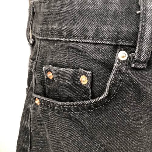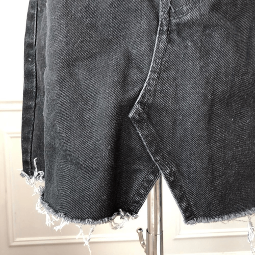 Bershka Denim Black raw hem button fly denim skirt with five pocket styling and notched front. Approximately 15 inches in length and 14.5 inches straight across the waist