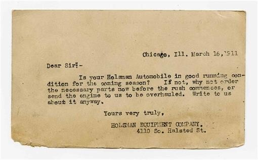 An original postcard sent to an owner of a Holsman Automobile from the Holsman Equipment Company of Chicago. Holsman Automobile Postcard , suggesting to the car owner that they Order Parts or Send Engine in for Overhaul, Dated 1911. in fair condition with worn edge and corners on one edge.