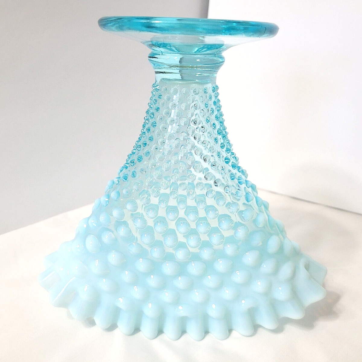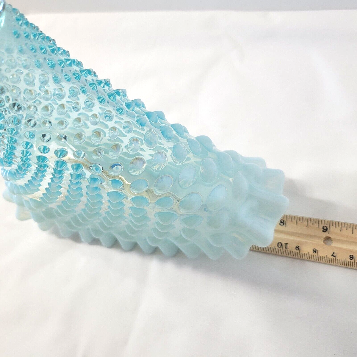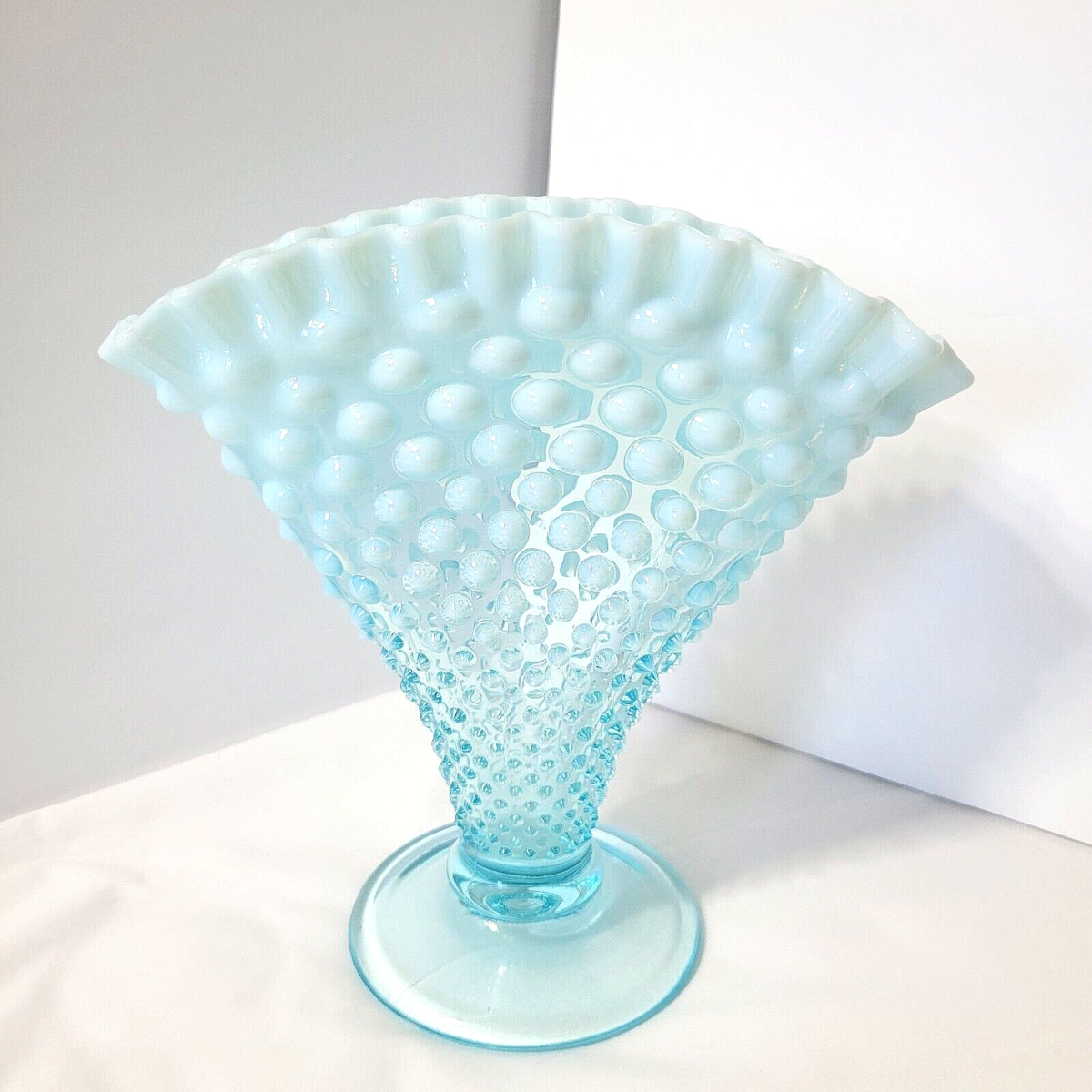 Vintage Fenton Blue Opalescent Hobnail Fan Vase Glass Ruffled Crimp Edge 8" x 8"