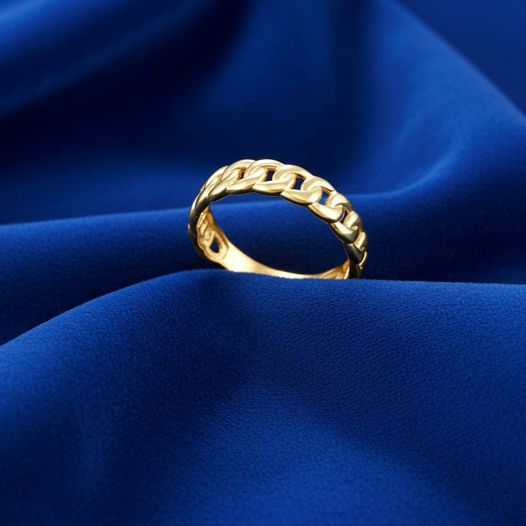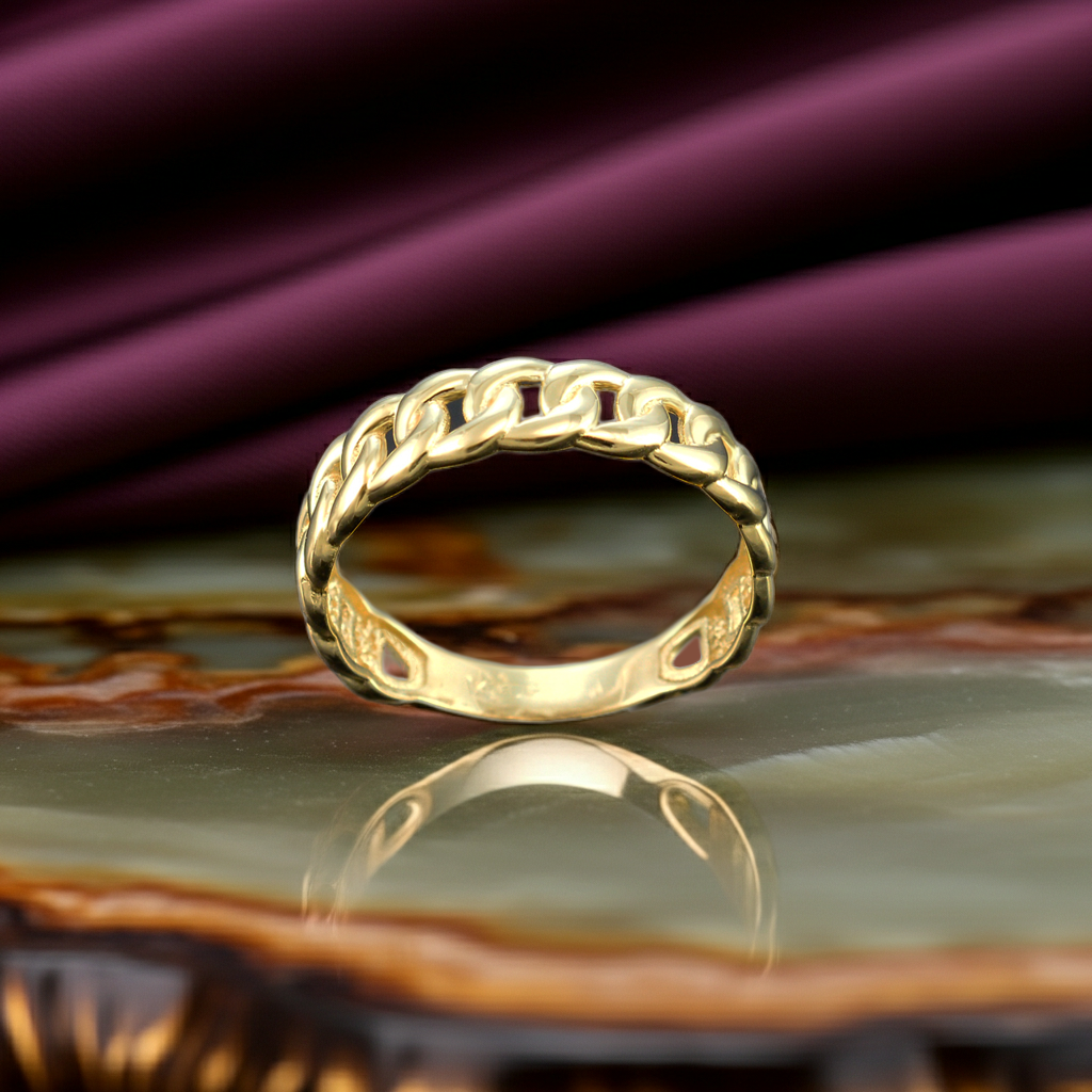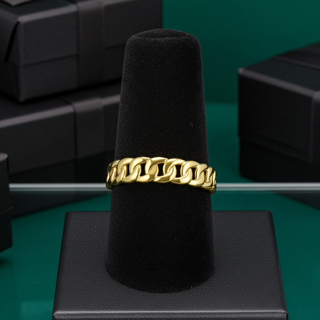 This Lightweight Gold Cuban Link Chain Ring brings a bold yet refined look inspired by classic Cuban link jewelry. Designed with a smooth, hand-polished finish, the interlocking links create a clean shine that feels modern and timeless at the same time. Comfortable enough for everyday wear, yet eye-catching enough to stand on its own, this unisex band is perfect worn solo or stacked.