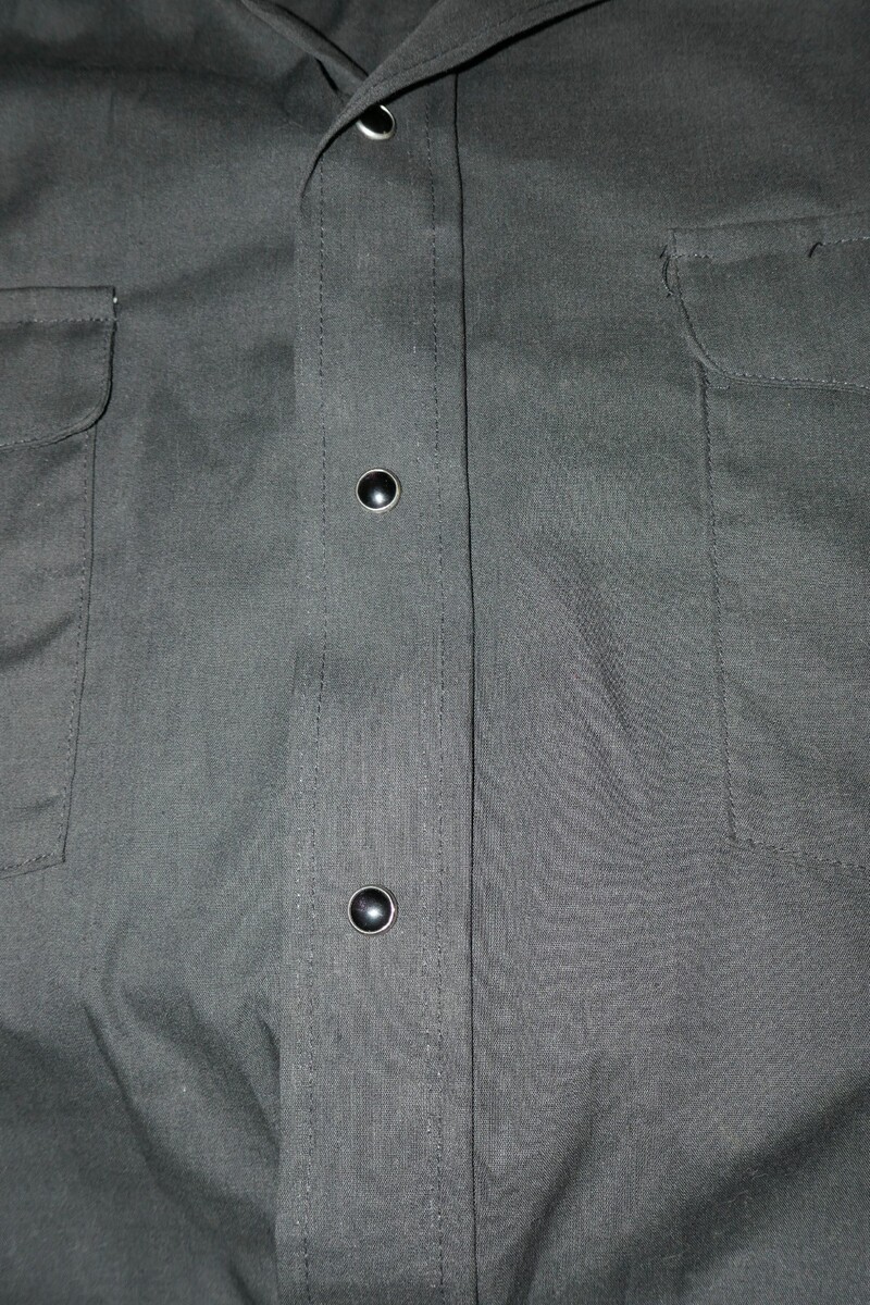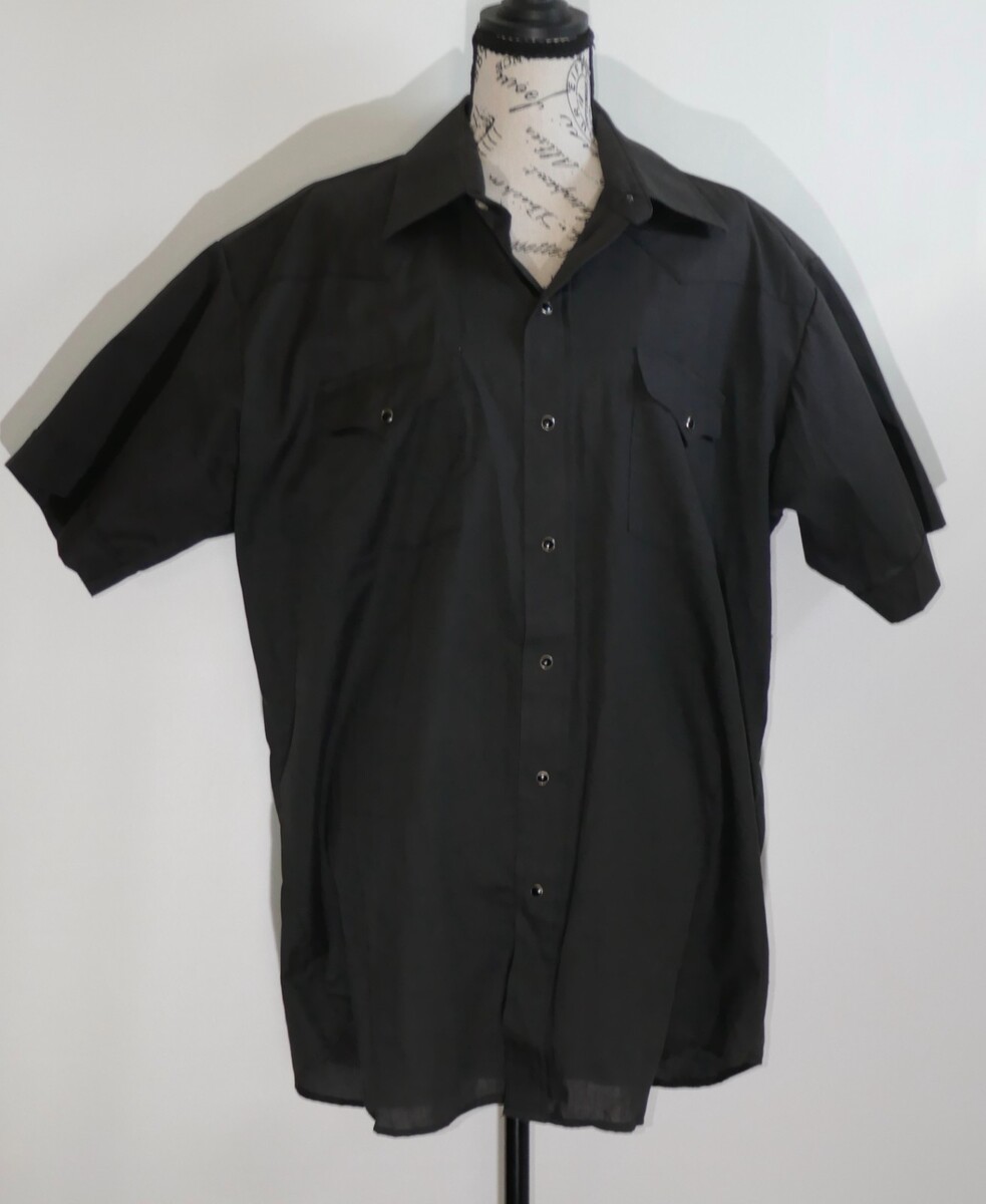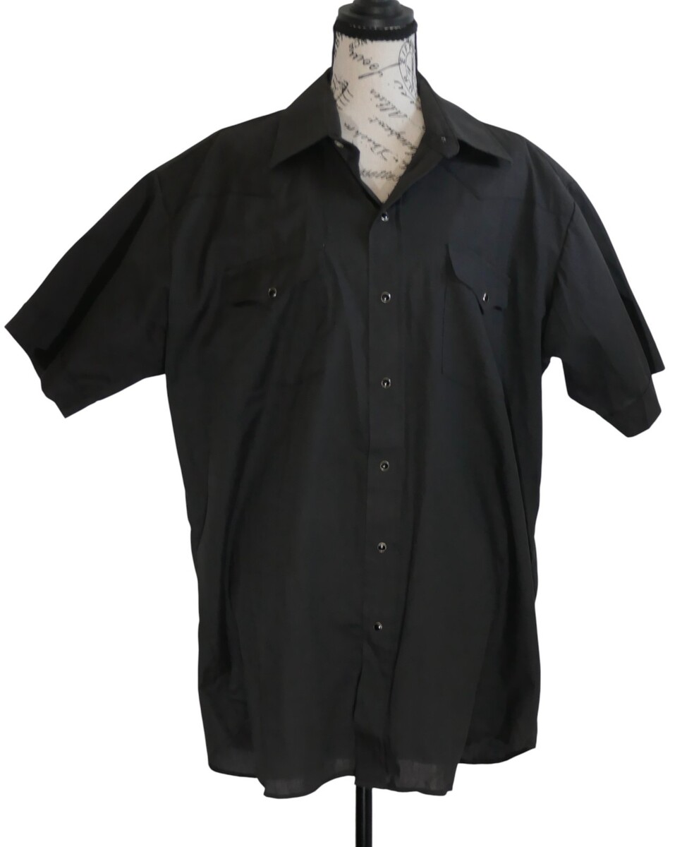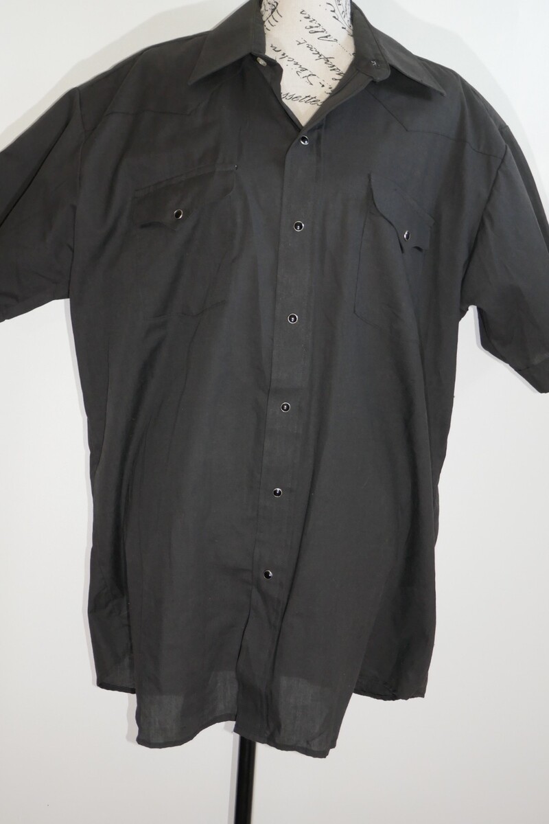 The Panhandle Slim Shirt is a stylish and classic piece perfect for casual occasions. This measures approx. 26" from pit to pit and 32" from shoulder to bottom hem with 9.5" long sleeves. The collar has some fading. Made from a comfortable blend of polyester and cotton, this shirt features a solid black color with a collared neckline and short sleeves. The snap closure adds a unique touch to this button-up shirt, and its lightweight fabric makes it suitable for all seasons.
