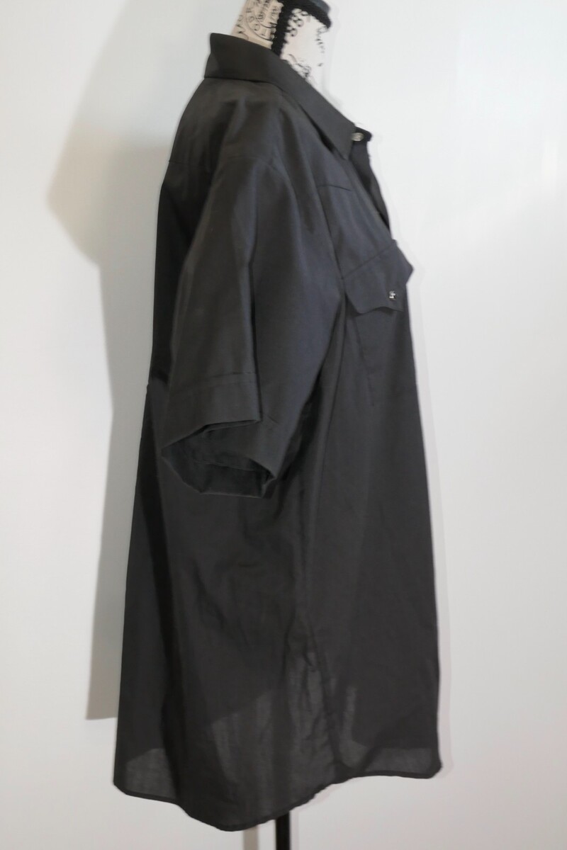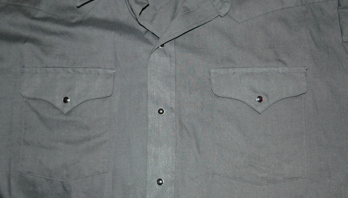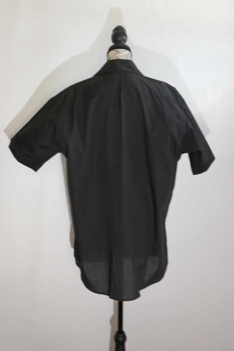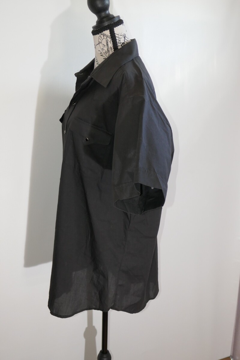 The Panhandle Slim Shirt is a stylish and classic piece perfect for casual occasions. This measures approx. 26" from pit to pit and 32" from shoulder to bottom hem with 9.5" long sleeves. The collar has some fading. Made from a comfortable blend of polyester and cotton, this shirt features a solid black color with a collared neckline and short sleeves. The snap closure adds a unique touch to this button-up shirt, and its lightweight fabric makes it suitable for all seasons.