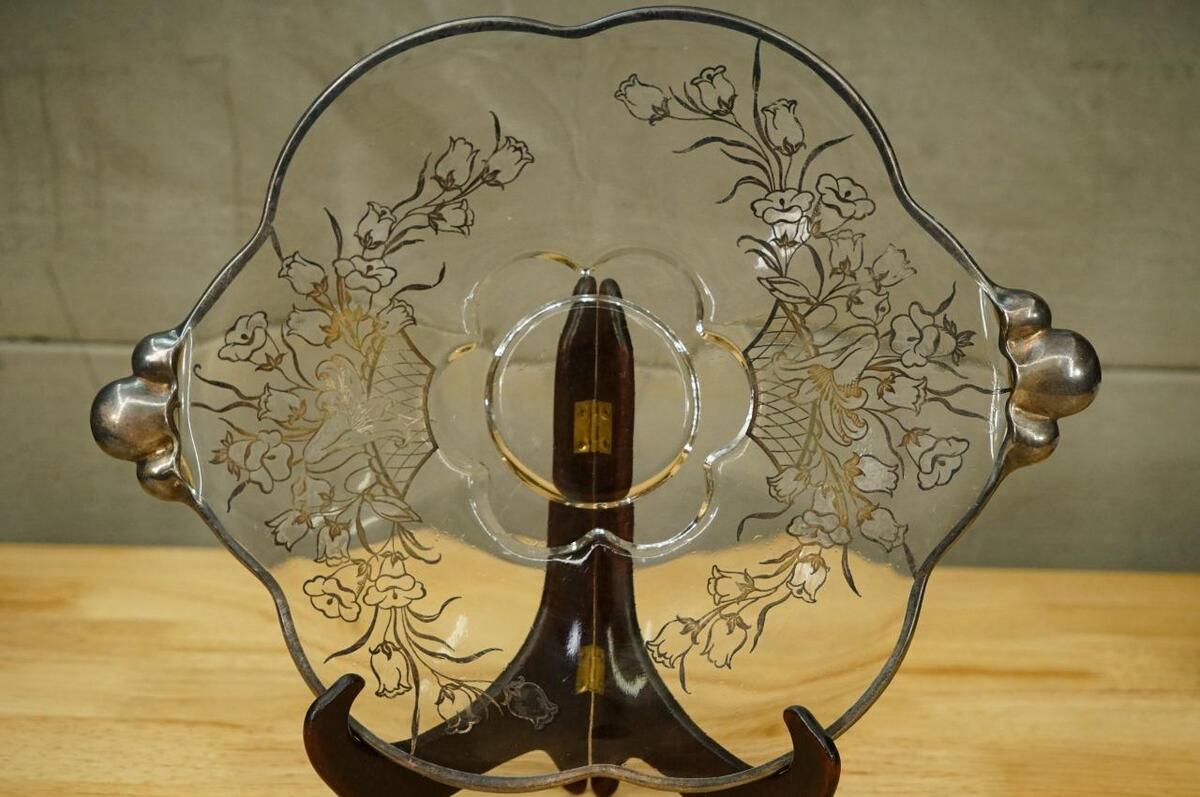 Vintage DUNCAN MILLER Glass Cake Plate Canterbury Silver Overlay Floral Basket