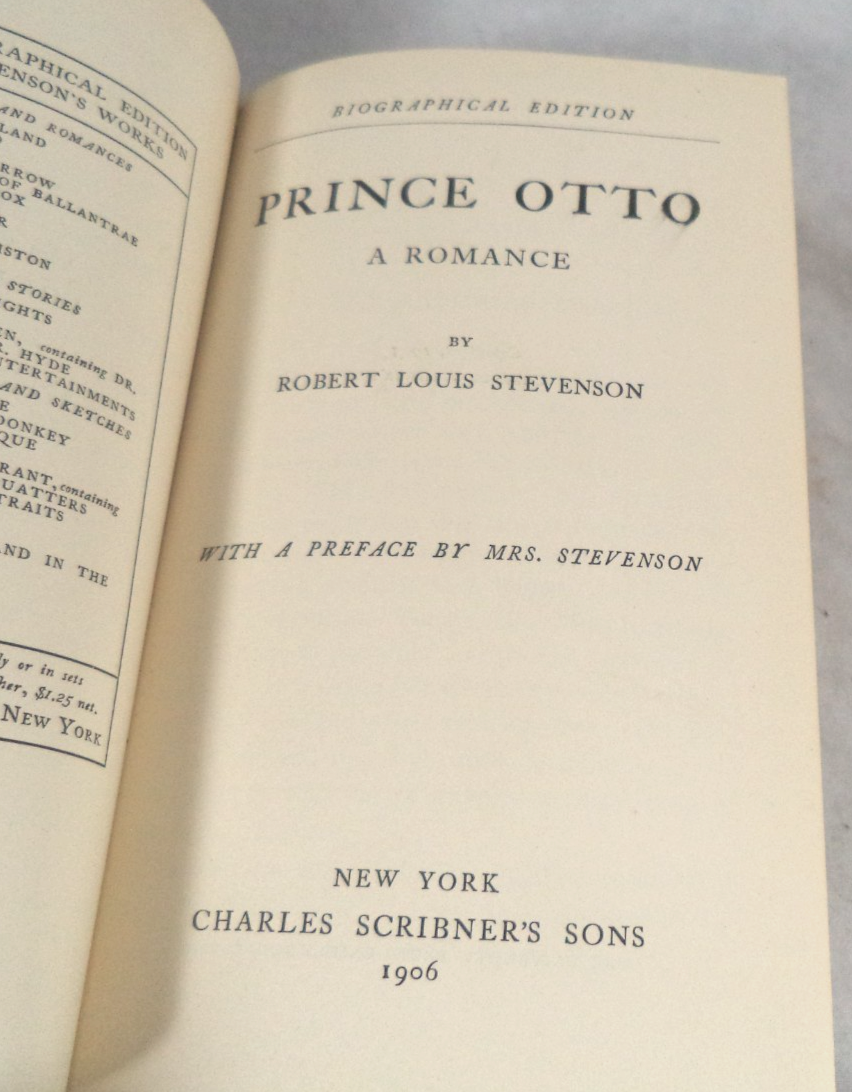 Description: The product is a vintage softcover book titled "Prince Otto" and "Kidnapped" by Robert Louis Stevenson, published by Charles Scribner's Sons in New York. These classic literature and fiction works are in English and were printed in 1906 and 1915, respectively. The books are original editions and not signed or personalized. This collectible set is a valuable addition to any book lover's collection, especially for fans of Stevenson's timeless tales set in North America.
