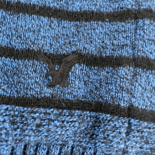 Men?s extra small American eagle 100% cotton stripe pullover sweater with 1/4 button closure. Blue with black stripe. Laying flat measures approximately 26 inches from shoulder to hem and 17.5? armpit to armpit.
