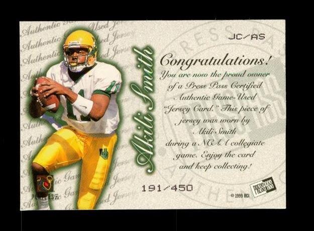 1999 Press Pass Jerseys 191/450 Akili Smith JC/AS Collegiate Game Jersey Relic. No smoke or pet odors. Raw and ungraded.