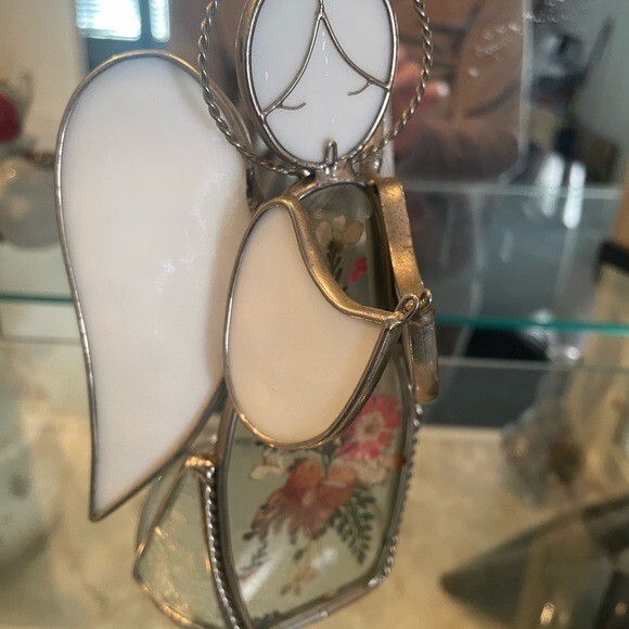 This vintage stained glass angel votive candle holder features a beautifully detailed floral design framed in softly colored stained glass with frosted glass wings and a soldered metal structure. When illuminated, it casts a warm, peaceful glow, making it a lovely accent for shelves, mantels, memorial spaces, or cozy cottage-style decor.