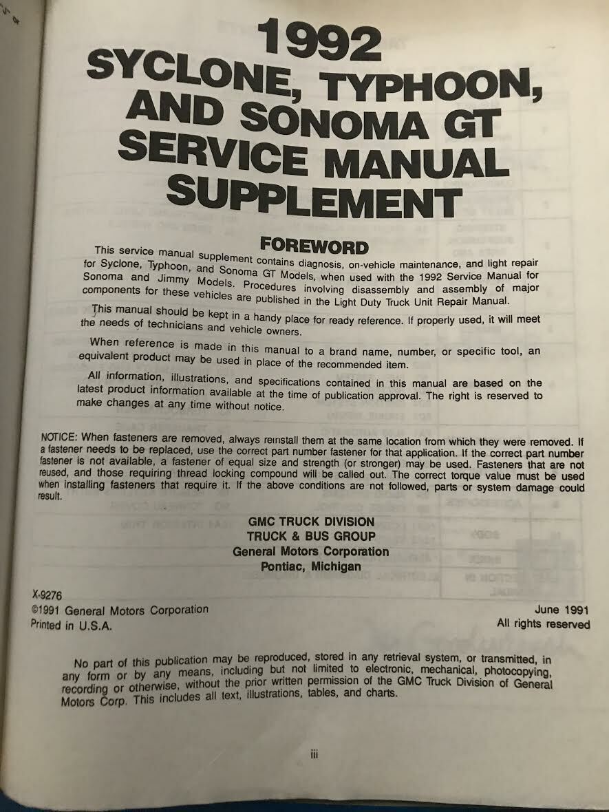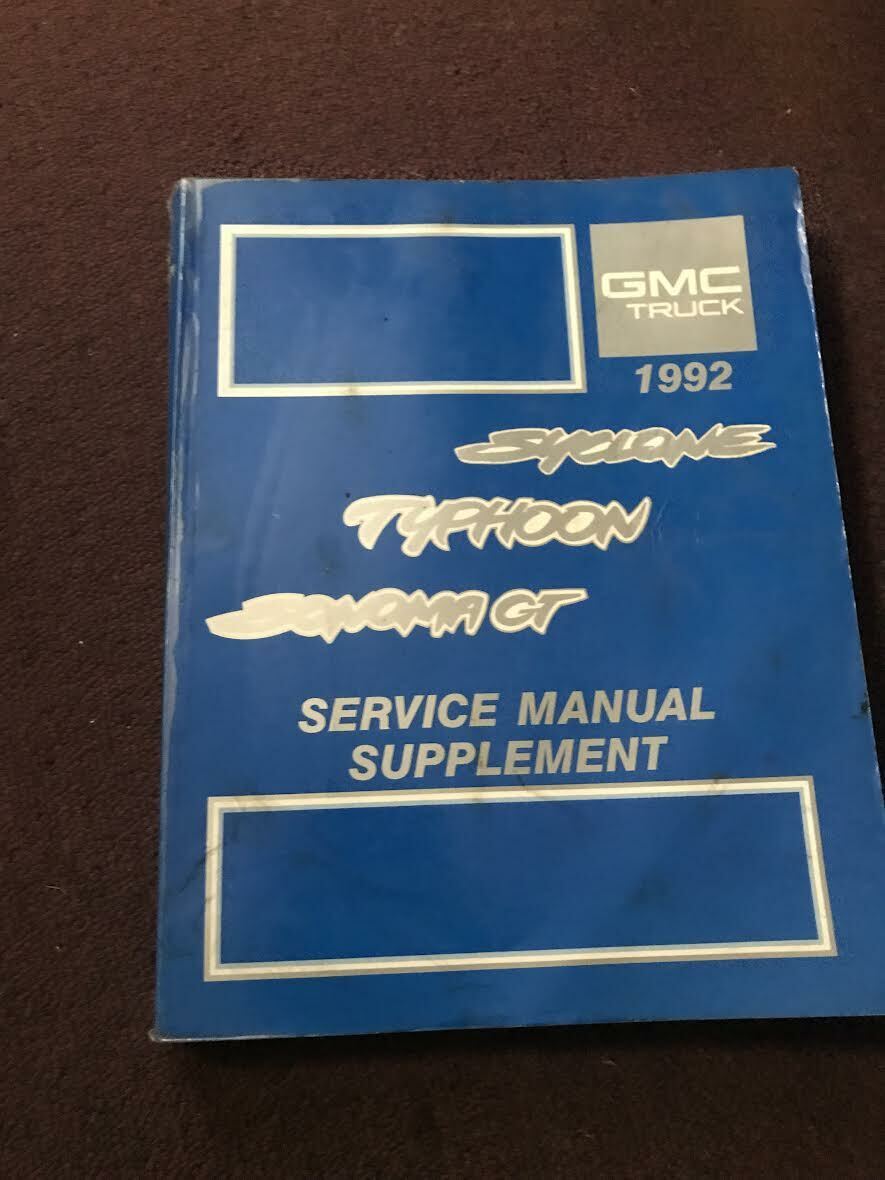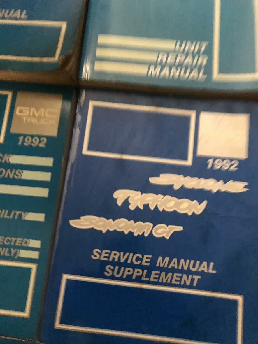 Factory 1992 GMC JIMMY /Sonoma Manuale di servizio, Manuale di riparazione delle unita, manuale di servizio di carburante ed emissioni, supplemento Syclone e diagrammi elettrici e diagnosi.