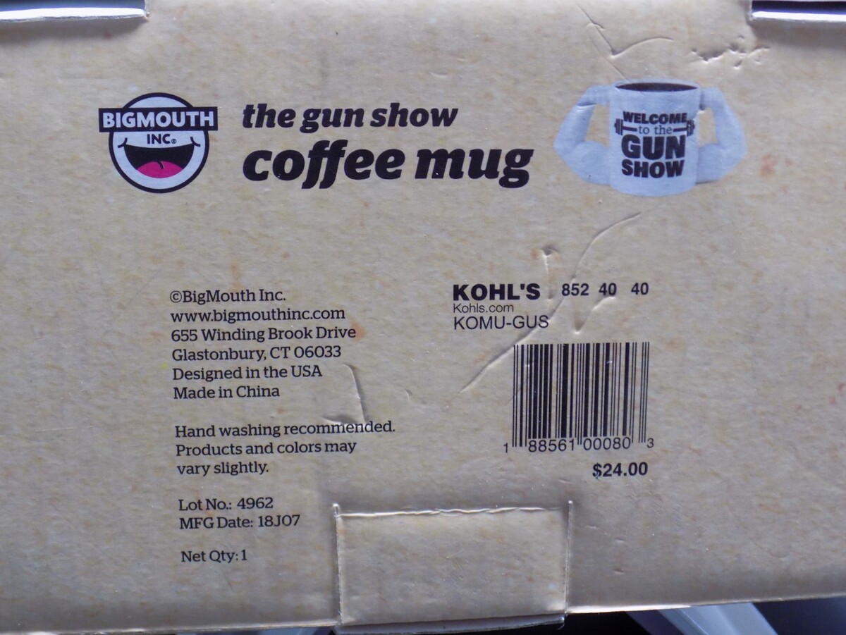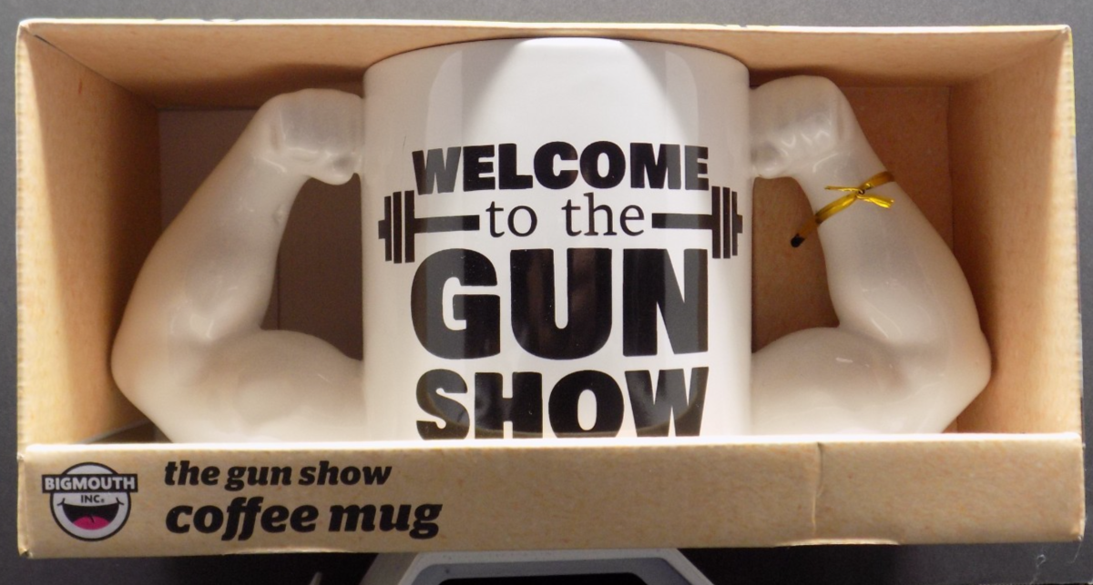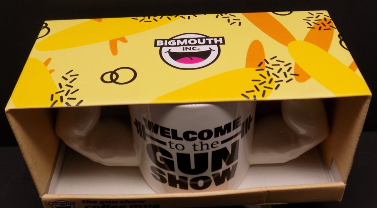 This BigMouth Inc. ?Welcome to the Gun Show? novelty coffee mug is a hilarious and collectible piece featuring dual muscular?arm handles and bold printed text. This is the 20 oz version, and it is brand new, never used, and comes in its original retail packaging.