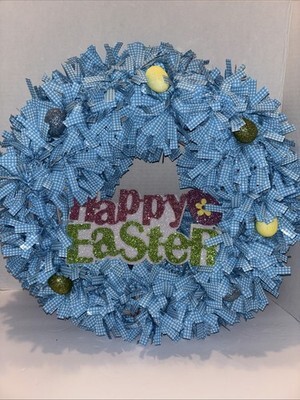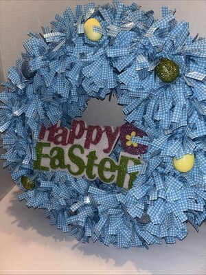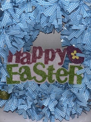 Adorable Blue Checkered Easter Themed Wreath, ‘Happy Easter’—SHIPS IN 24 HOURS