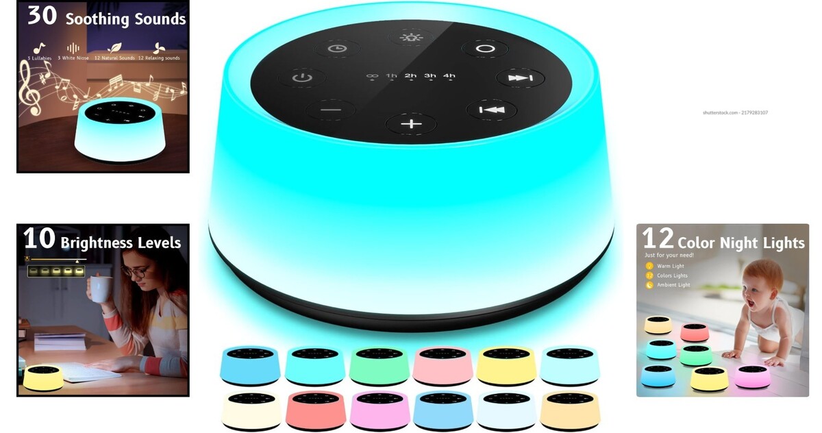 Elegant Sound Machine with 30 Relaxing Sounds 12 Color Night Light - Black