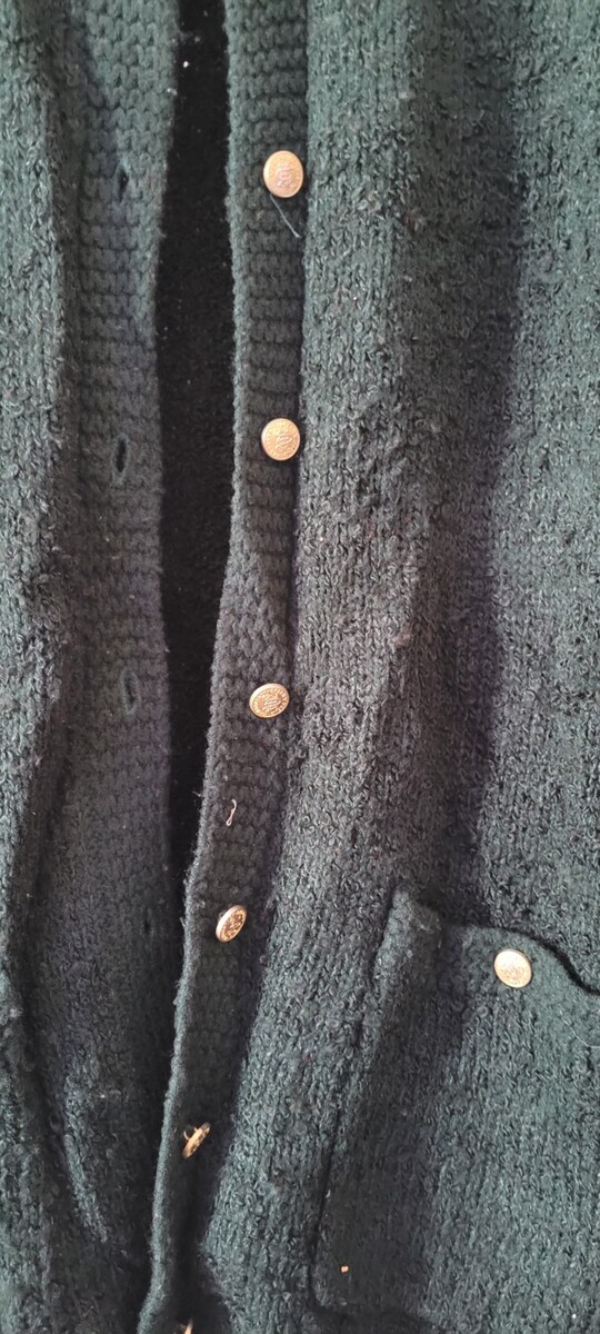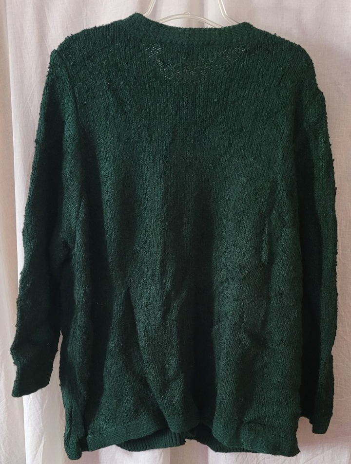 This cardigan is in good used condition. There are no holes or stains that I found. All of the buttons are intact. The size is 2XL. Measurements are approximately: Length: 31 inches. Pit to Pit: 27 inches. Sleeve: 26 inches.