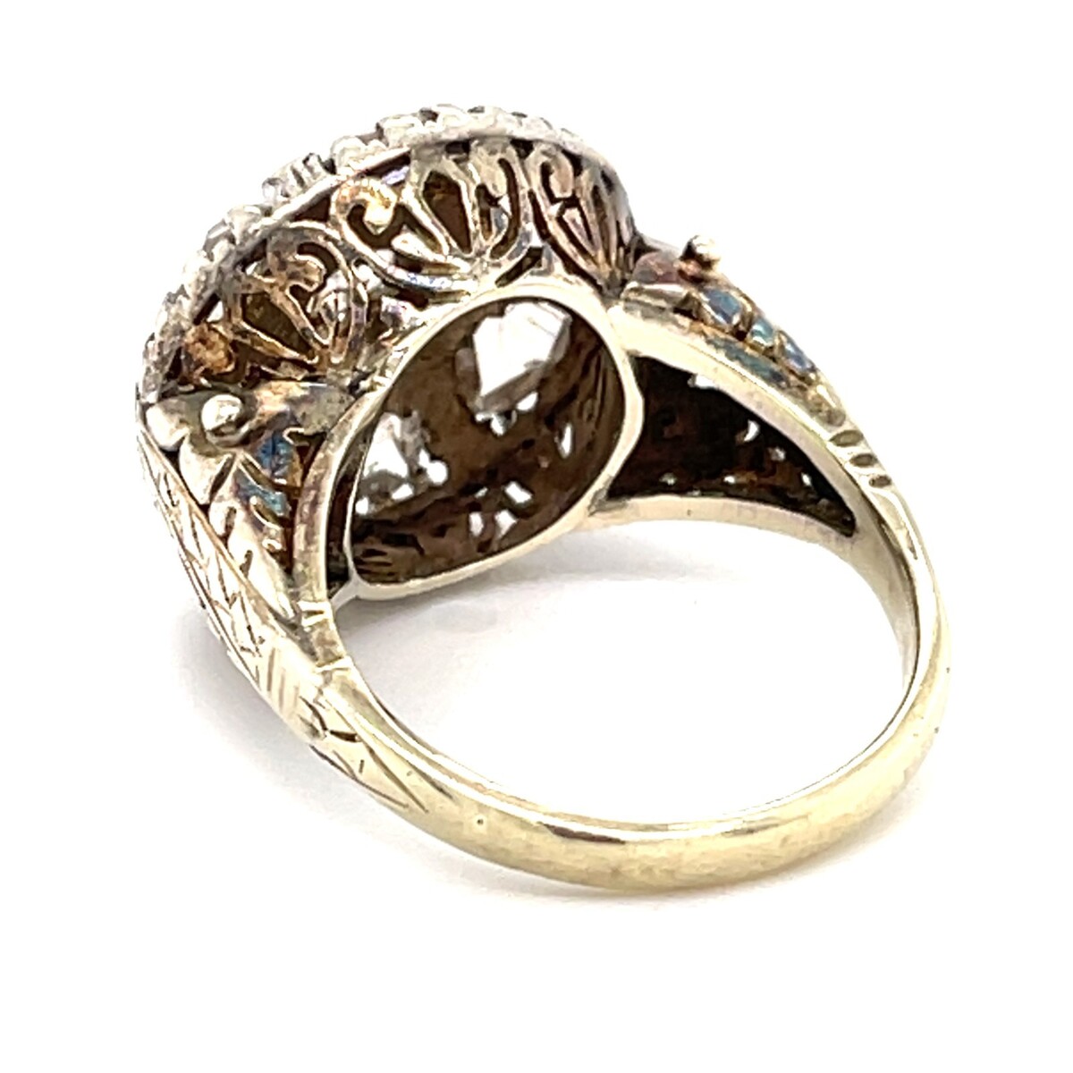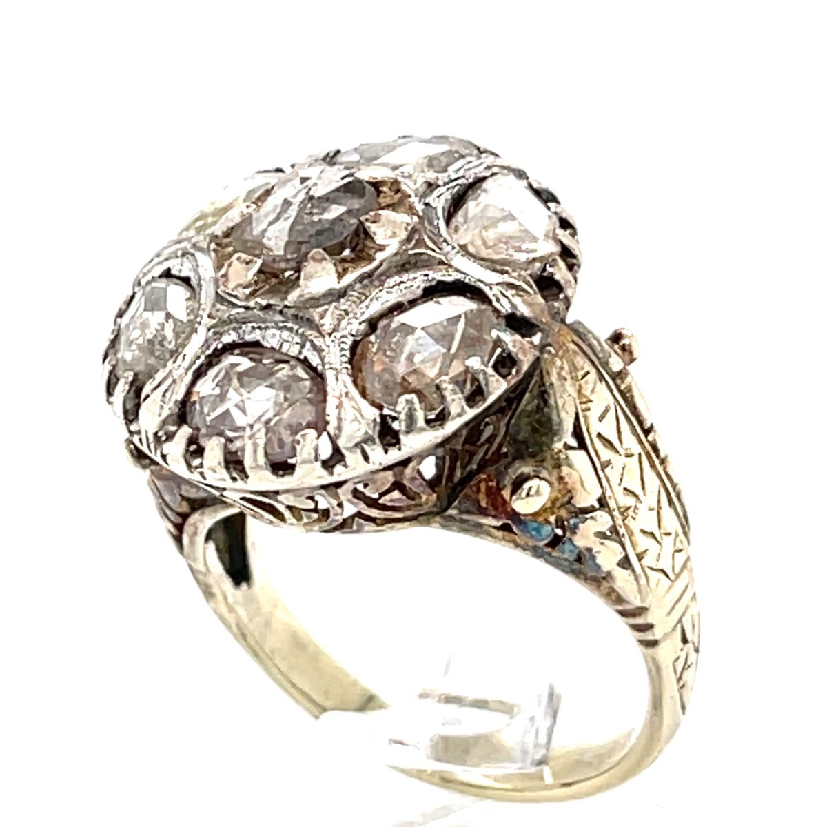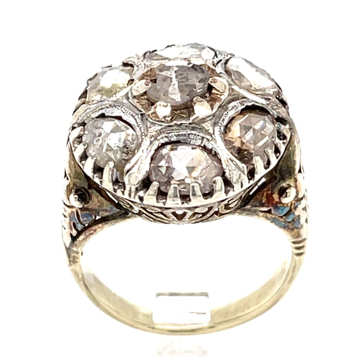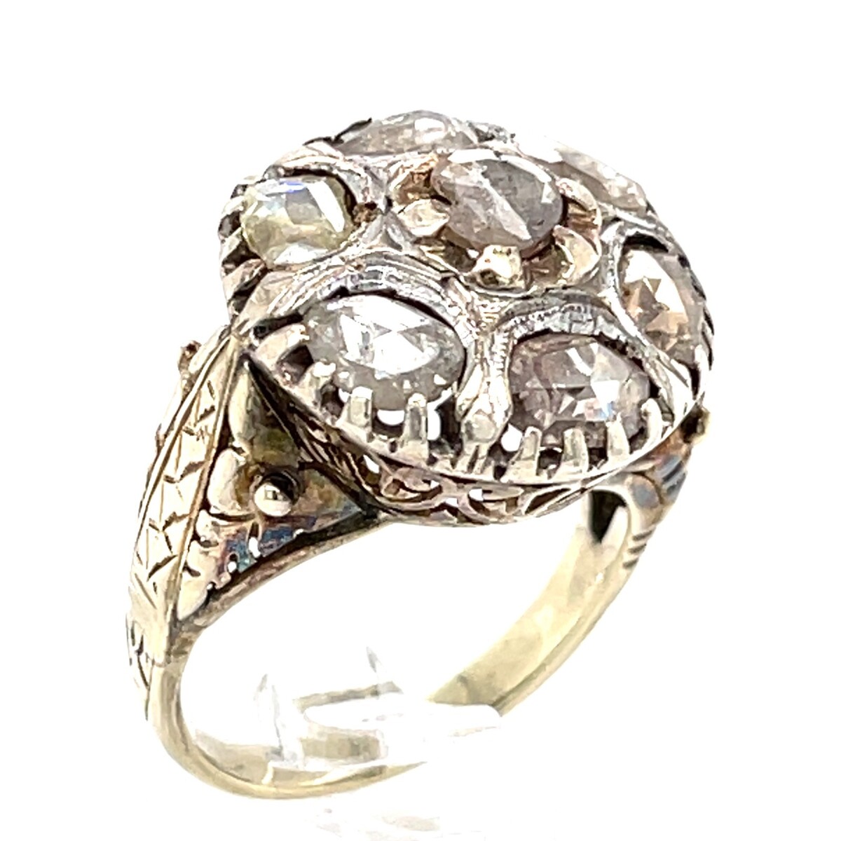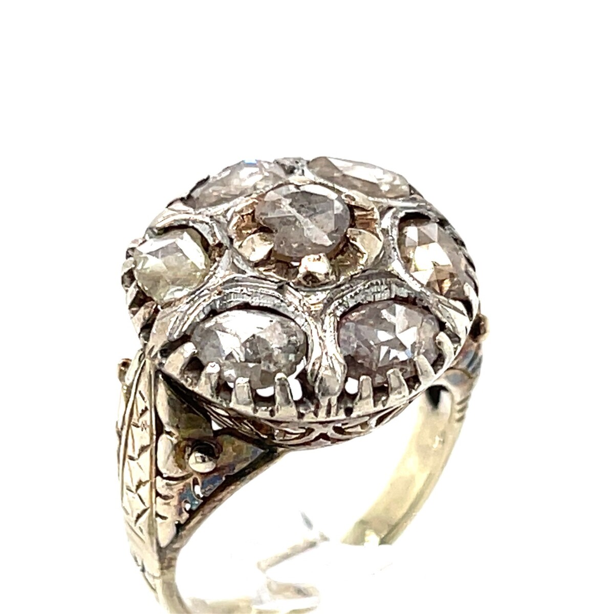 Beautiful antique two-tone gold ring set with seven large sparkling rose-cut diamonds in a bold domed design. Weighs 7.1 grams and is ring size 6.75. Intricate detailing and classic antique character make this a standout statement piece.