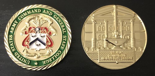 United States Army Command And General Staff College surround the college crest on one side of this coin from Challenge Coin. The other side depicts a replica of the college.