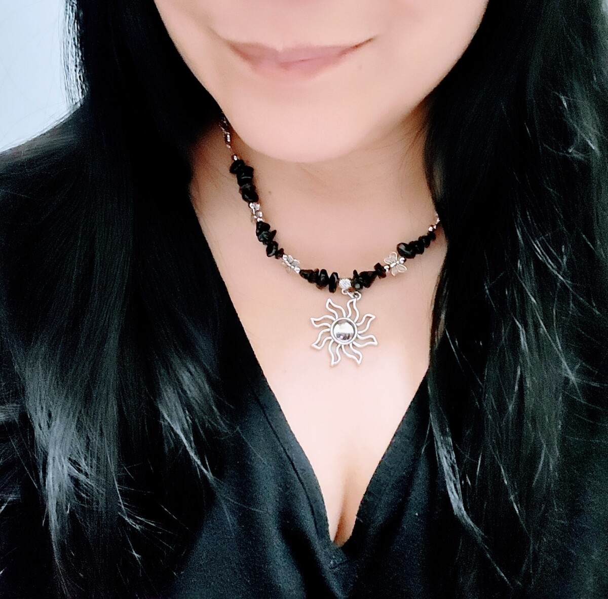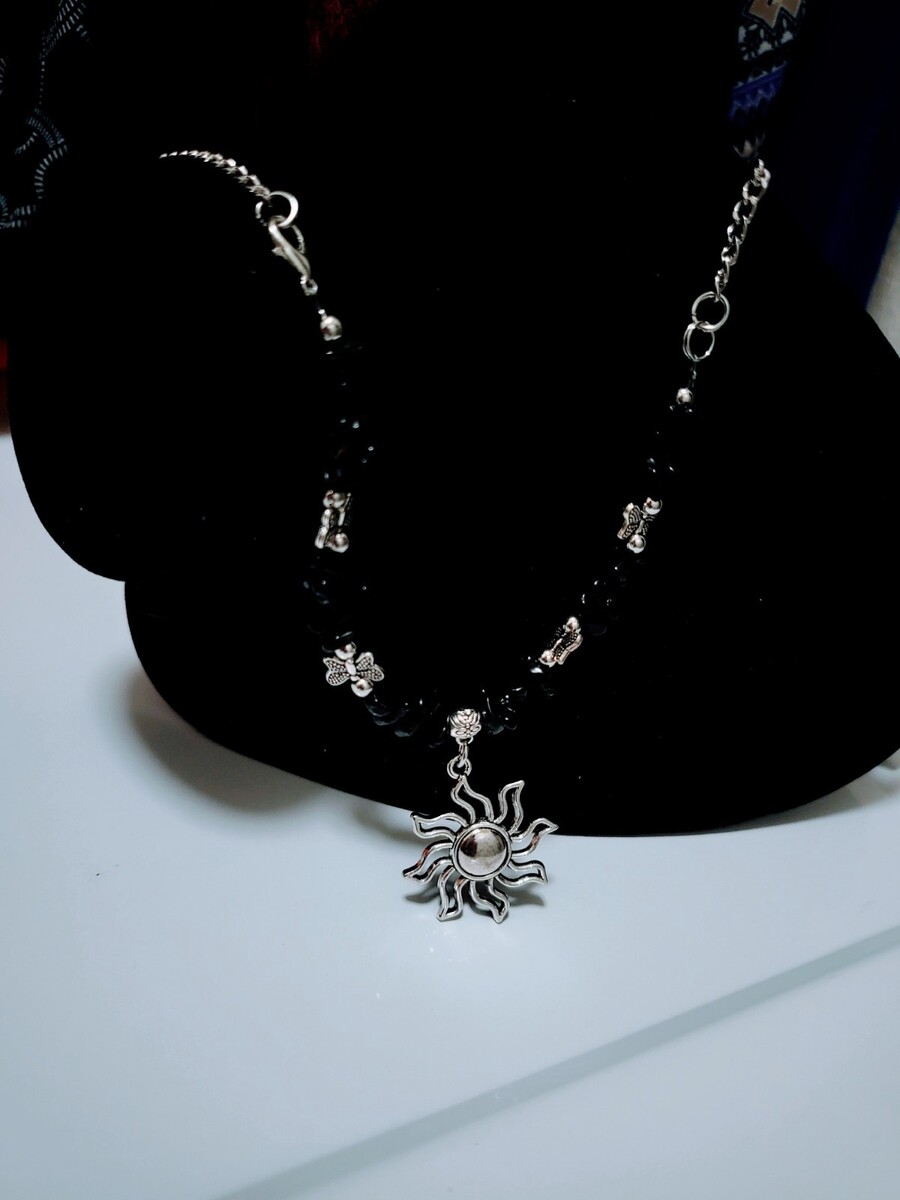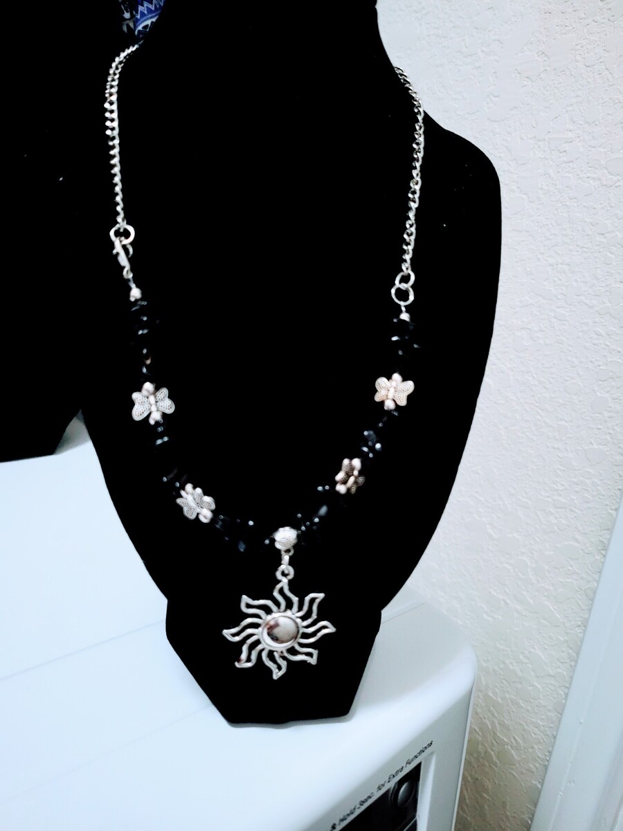 ? Sunshine Necklace with Black Beads and Butterfly Silver Accents Sun Pendant for Women