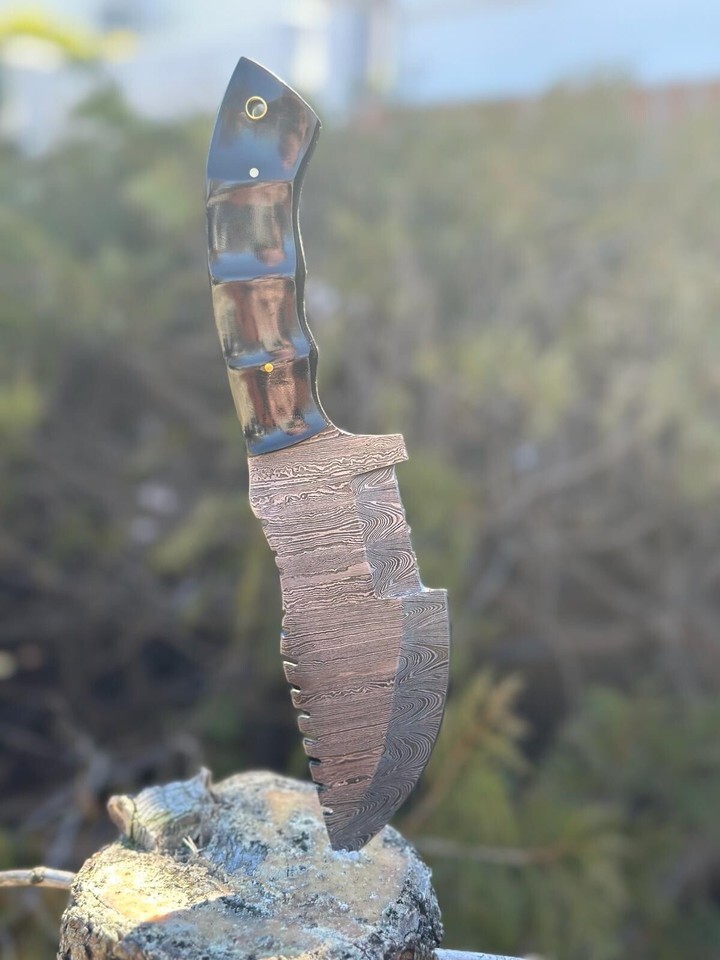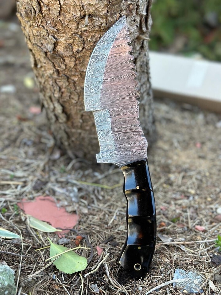 This hand-forged Damascus steel hunting knife is a versatile tool that can be used for a variety of purposes such as tactical operations, hunting, camping, and everyday carry. The blade is 5 inches long and has a plain edge with a trailing point design. The knife has a full tang construction and a bull horn handle that provides a comfortable grip.