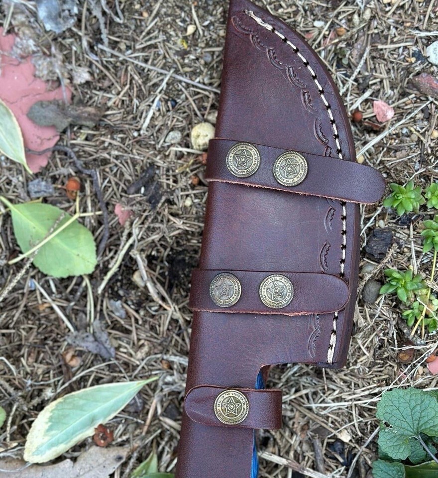This original handmade knife is a fine art piece with its damascus guard and blade color. It comes with a sheath and is a perfect gift for outdoor enthusiasts and collectors. The knife is an authentic piece made in the United States and measures 10 inches overall. Its features include ambidextrous dexterity, oil quenched heat treatment, and a variety of uses such as butcher, chef, and survival.