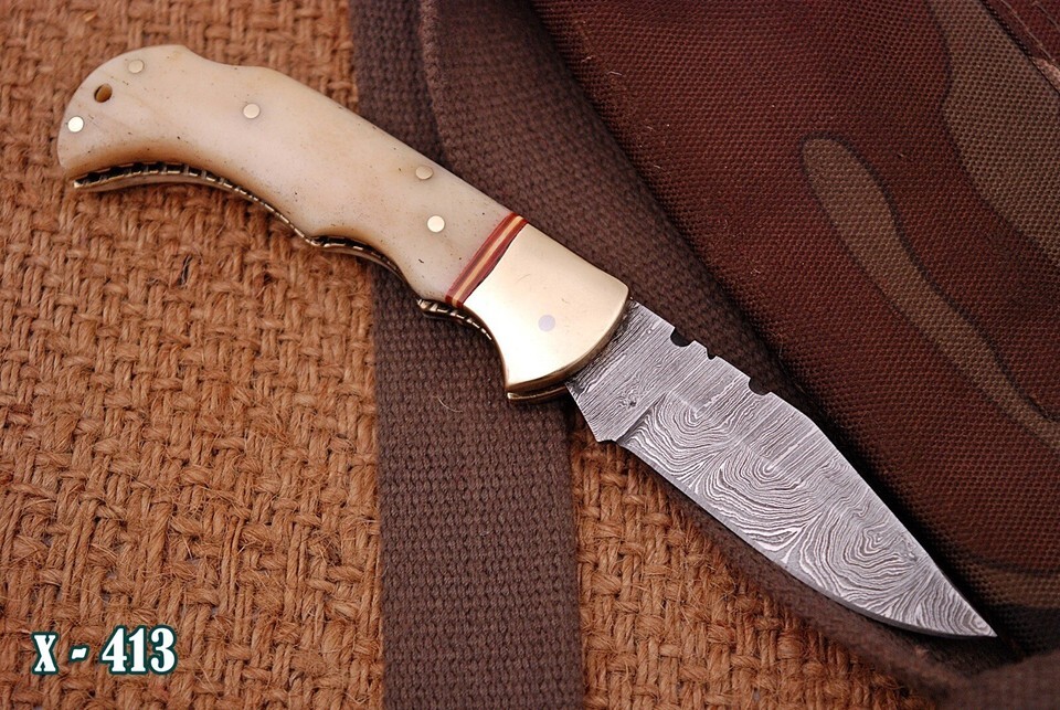 Damascus Steel CAMPING TACTICAL FOLDING blade POCKET Knife Camel Bone Handle EDC