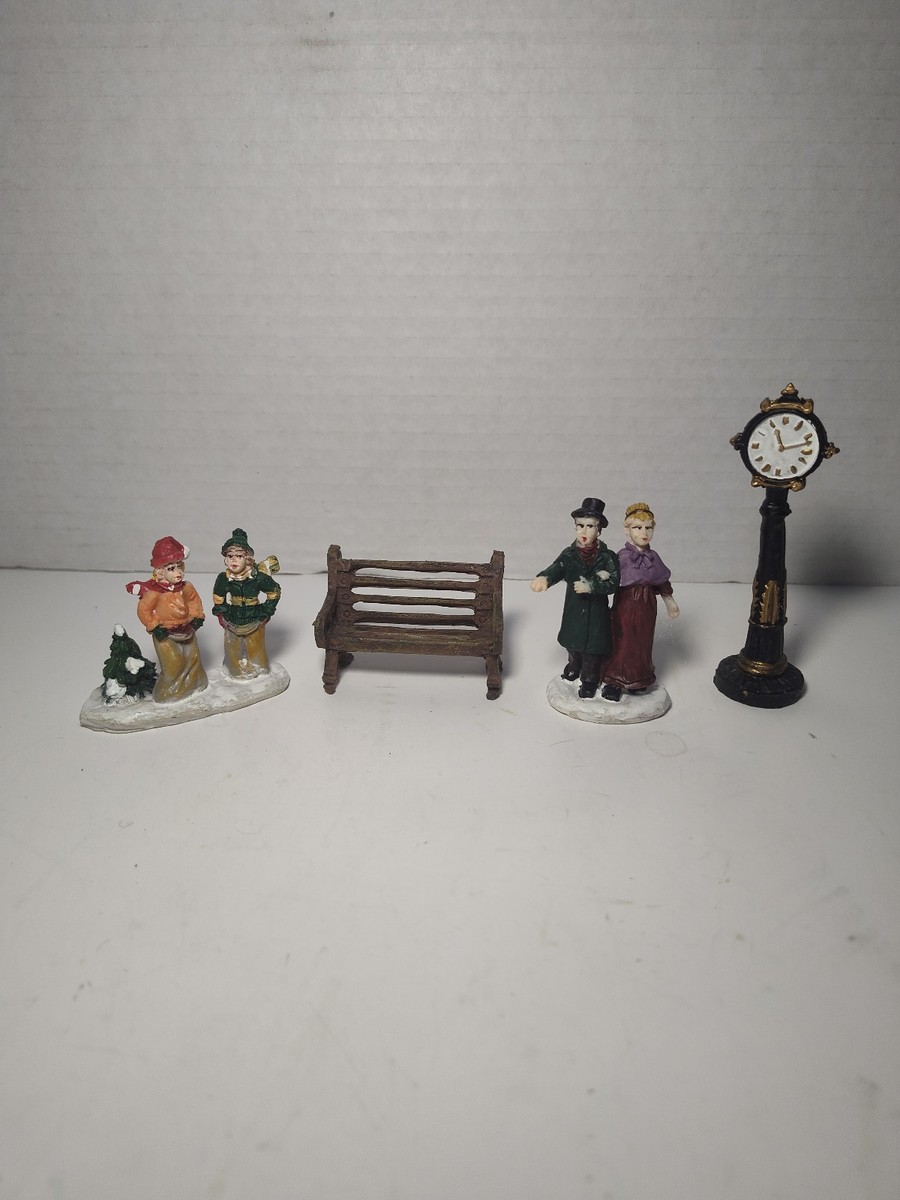 Lemax Vintage Christmas Village Assorted Pieces, Lot of 4 (Clock, bench, people)