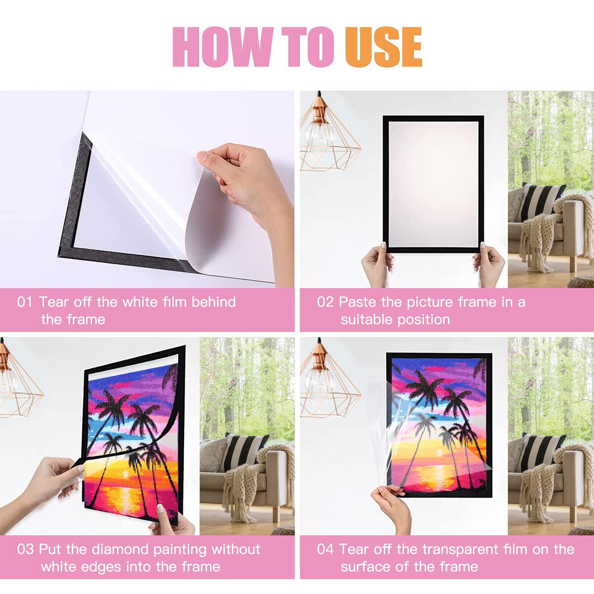 UNIQUE DESIGN: 5D diamond painting frame is made of high-quality PVC material and magnets. The powerful magnetic strip holds the diamond painting so that the painting will not fall off the frame. (Please note: the diamond picture frame is not a wooden frame, it is a new type of magnetic frame designed for diamond painting),PERFECT SIZE: The frame is suitable for diamond paintings of 12x16in/30x40cm or 16x12in/40x30cm. Before installing, you need to cut off the white area on the edge of the diamond painting. (Actual inner frame size: 25x35cm),MULTI-PURPOSE: Diamond painting frames can be used to display diamond paintings, photos, posters, certificates, art paintings, etc. It can be pasted on the walls of living room, bedroom, kitchen, dining room, bathroom, bar, dining room, office, etc. as decoration,EASY TO USE: Clean the walls; Tear off the back film of the frame and paste the frame to a suitable position; Cut off the extra edges of your finished diamond painting and put it into the frame; Tear off the transparent protective film on the picture frame,SATISFACTORY SERVICE: As an honest seller, we will be responsible for every customer's order. If you have any questions about the product, feel free to contact us, we will answer your questions within 24 hours