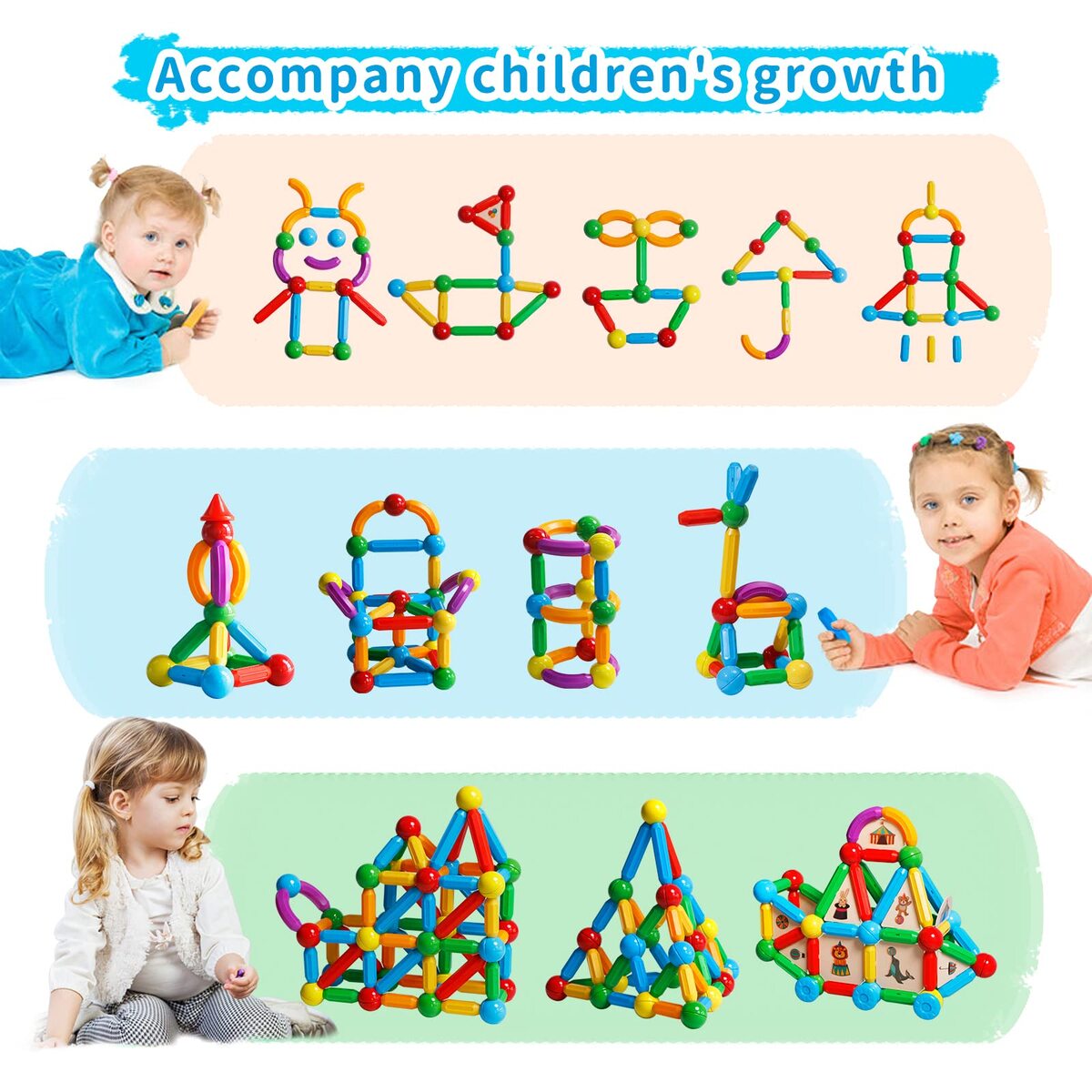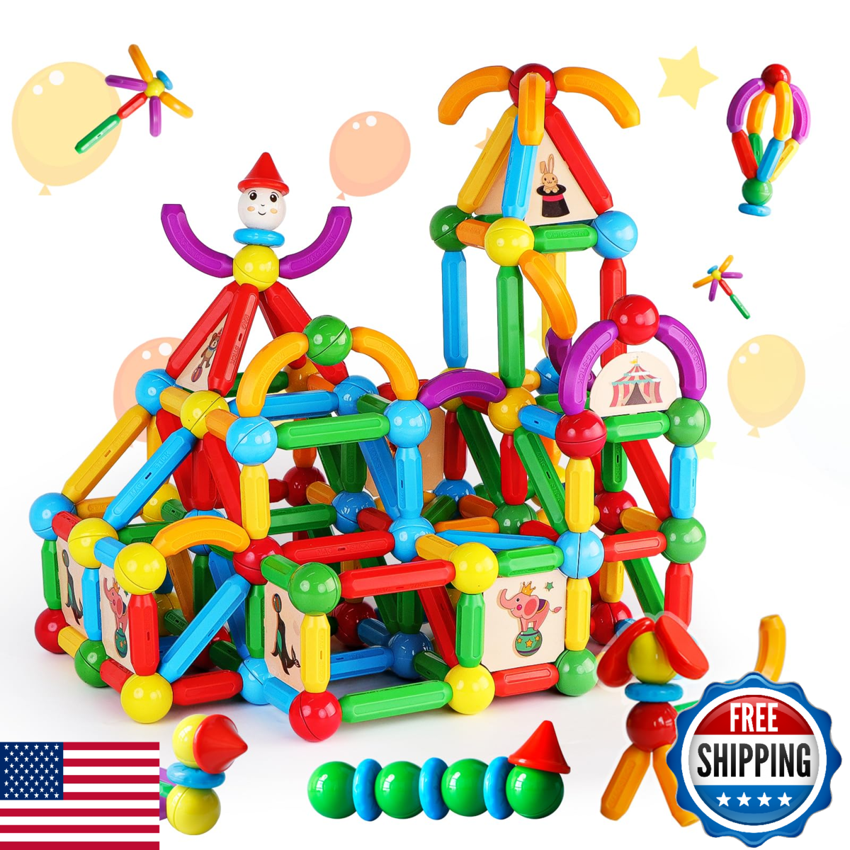 Learn By Play: STEM - Powered Fun for All Ages This open - ended magnetic stick set suits kids of every age. It fuels open - creative play, enhancing children's STEM skills. As they build, kids improve hand - eye coordination, visual - spatial awareness, and fine motor skills, while also learning patience. Ideal for parents seeking educational and engaging toys.,Spark Imagination: Build Endless Creations with Magnetic Sticks These magnetic building sticks let kids' creativity soar. They can assemble cars, houses, geometric patterns - from 2D to 3D. Building with partners adds to the fun, creating amazing structures and pure joy. A great choice for imaginative kids.,Safety First: Strong Magnets, Secure Design Our magnetic toy uses high - quality ABS plastic and 2 strong magnets. Ultrasonic pressing ensures good sealing and durability. The large pieces are easy to hold and prevent choking. Parents can trust this safe and well - made toy.,Creative Circus Series: Unique Magnetic Building Fun The TOKBLOK set has 76 colorful, shaped pieces including metal balls and rods. Unlike traditional sets, it adds cute doll accessories, cards, and circus stickers. This makes structures more stable and gameplay more interesting.,Perfect Gift: STEM - Toy Delight for Any Occasion In an exquisite box, this magnetic balls and rods set is a top gift for Christmas, birthdays, or festivals. Its educational and fun nature appeals to kids. They'll enjoy endless STEM - focused play.