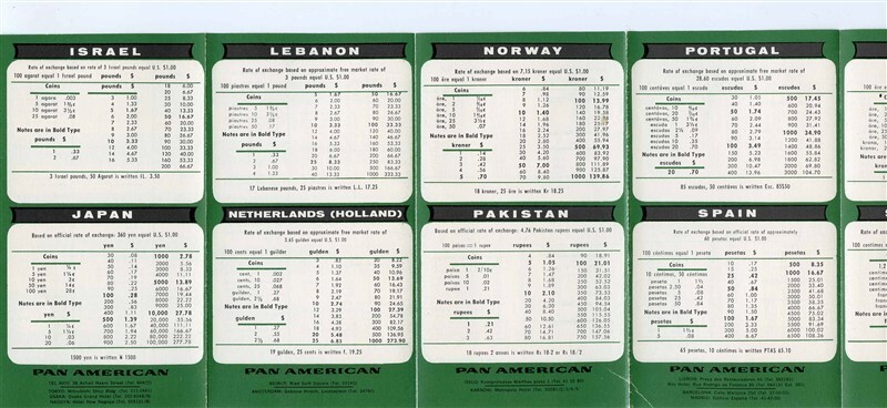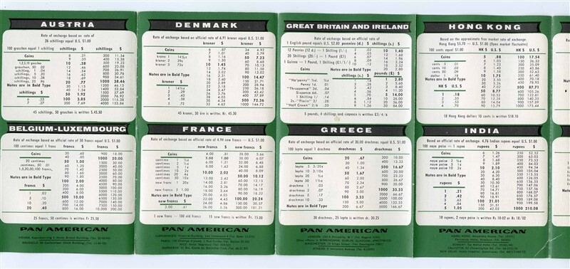 A 14 panel fold out Pan American Clipper Passengers Currency Converter Pocket Size Brochure. Dated 1963 . Measures about 2 7/8" x 5" when closed. HAs currency information and exchange rates for 22 countries and Customs regulations for those countries.