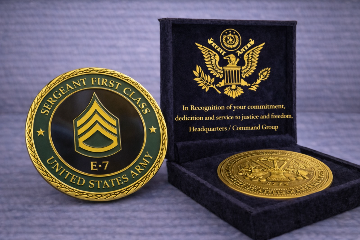 The product is a set of 2 original challenge coins featuring the United States Army E-7 SFC Sergeant First Class rank with an Achievement Award design. These coins are authentic and made in the United States, focusing on a militaria theme. Perfect for collectors or enthusiasts of military memorabilia, these coins represent a piece of history and honor the accomplishments of soldiers in the US Army.