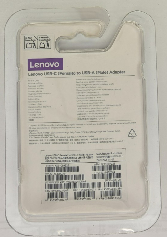 With the Lenovo USB-C (female) to USB-A (male) adapter, you can achieve more universal connectivity: both USB-C and USB -A with a simple plug and play.