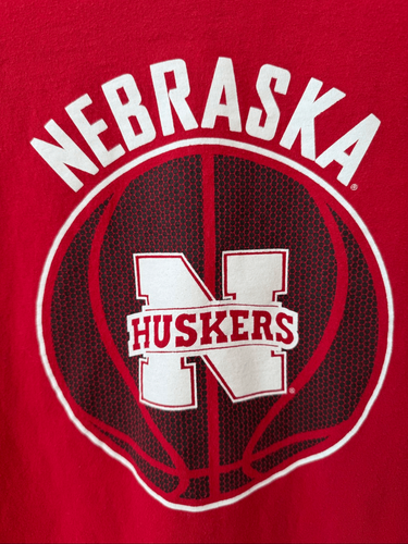 Pro Edge Nebraska huskers men?s short sleeve T-shirt in red with large basketball graphic and Nebraska Hunt huskers on the front. Laying flat measures 27? shoulder to hem and 23? armpit to armpit. Tag size XL. 100% COTTON.