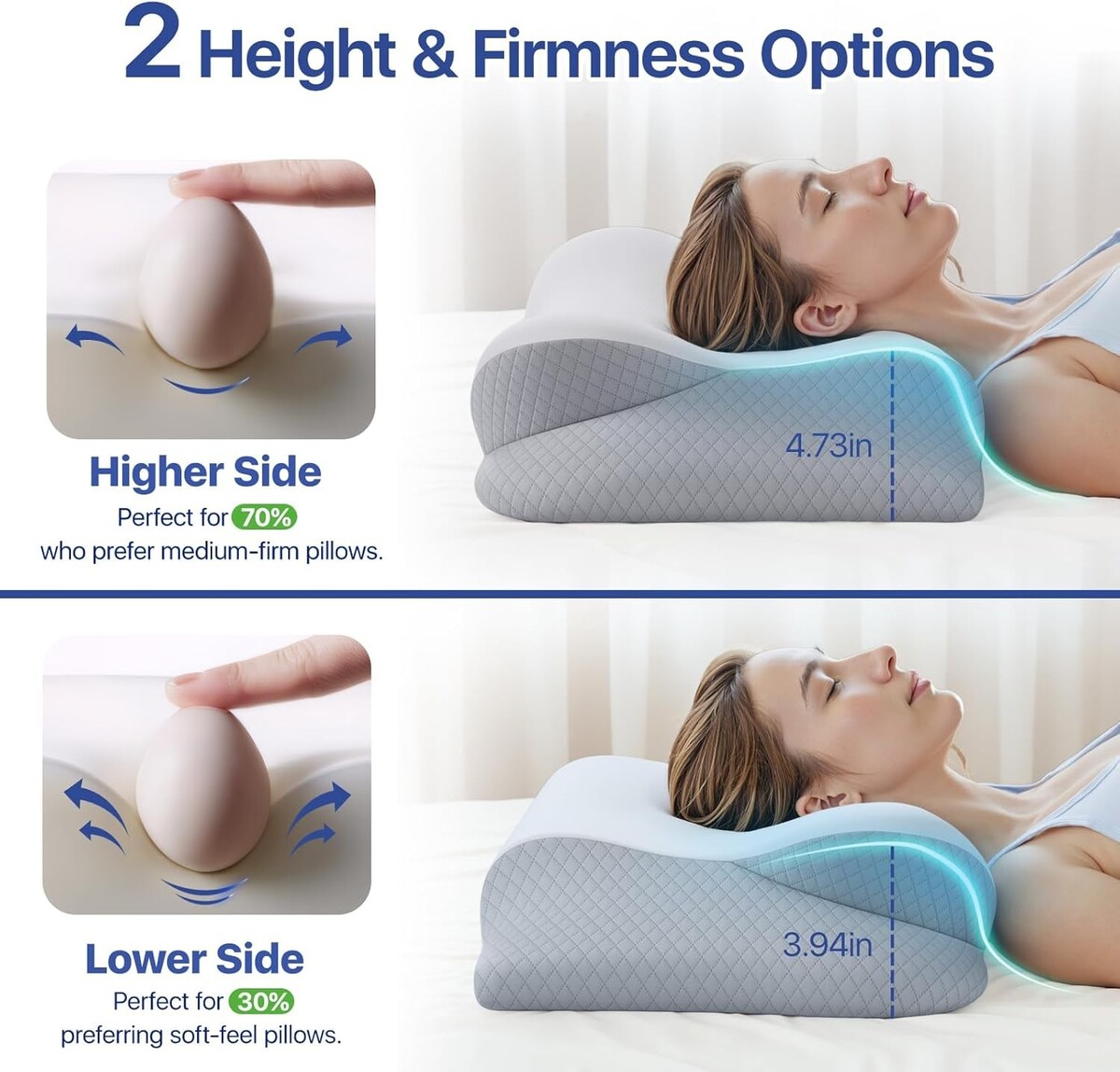 Dual-Height Dual-Firmness Design: High side measures 4.73 inches with medium firmness?ideal for 70% of sleepers, while the low side at 3.94 inches offers a plush feel for the remaining 30%.