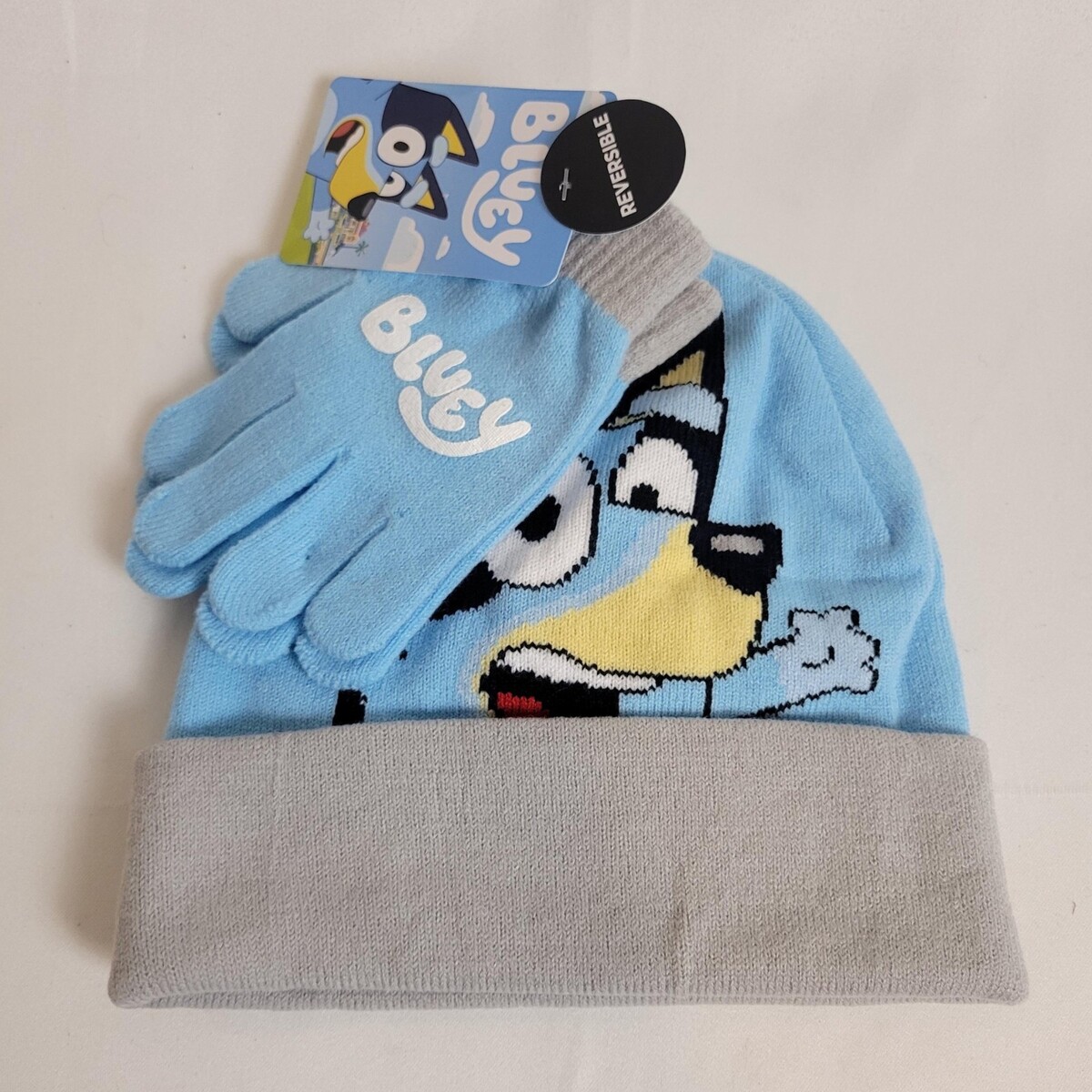 New NWT Children's Bluey Reversible Pom Beanie Hat and Gloves Set Blue Orange
